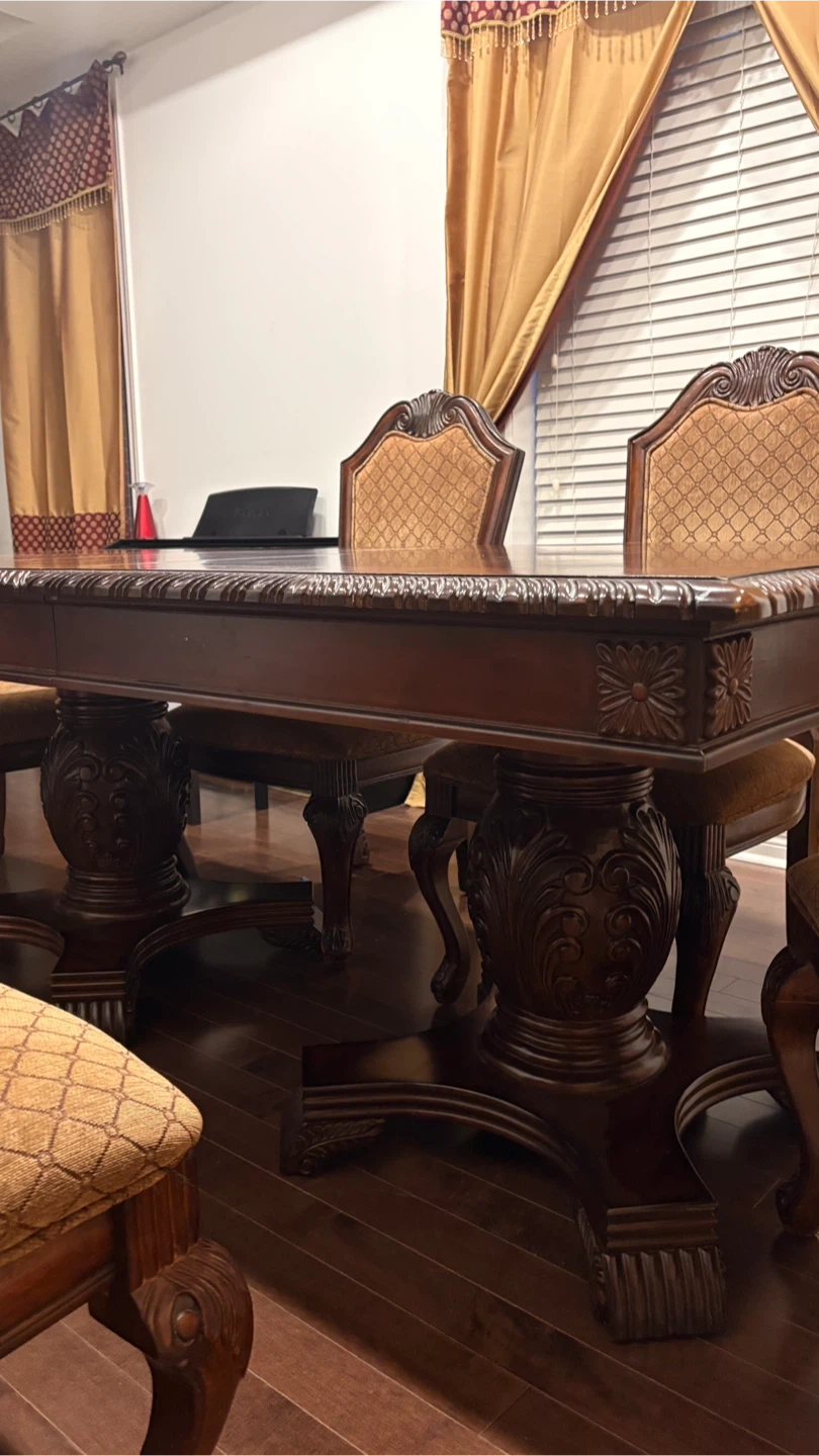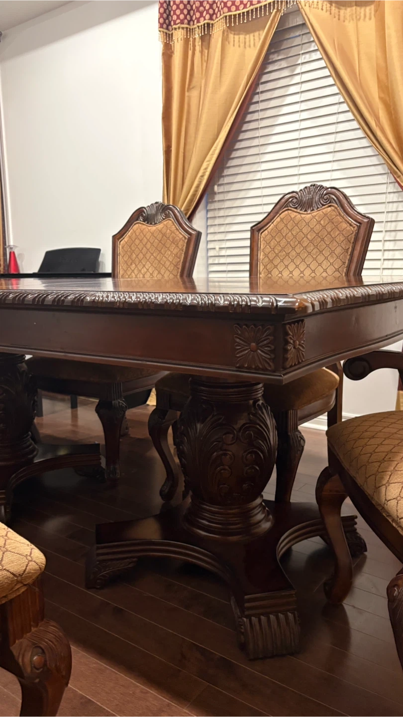 Selling a beautiful dining table set. It features a dark wood finish with ornate detailing on the table edges and chair backs. The table top has some scratches. The chairs have patterned fabric seats and backs. It's a lovely set for family dinners or entertaining guests!