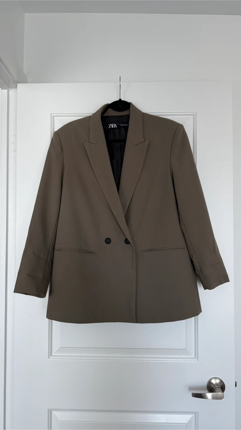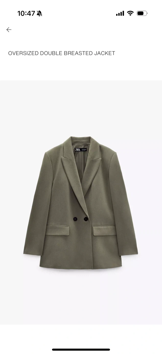 Selling a Zara oversized double-breasted jacket. It's a size M and in great condition! The colour is a lovely muted olive green. Perfect for layering or wearing on its own