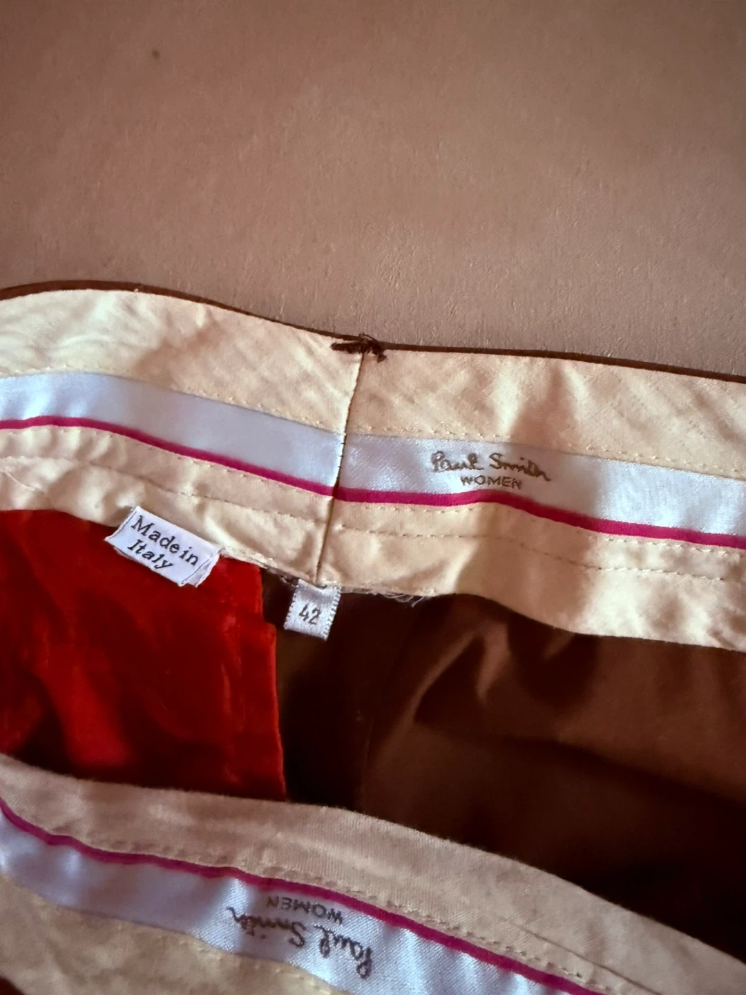 Selling a Paul Smith vintage women's pant suit in a beautiful brown colour! The suit is a size 42 and is made in Italy. It features a striking red lining that adds a pop of colour and style. It’s very light and comfortable to wear.