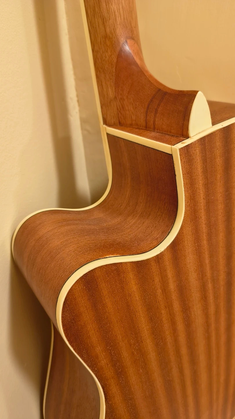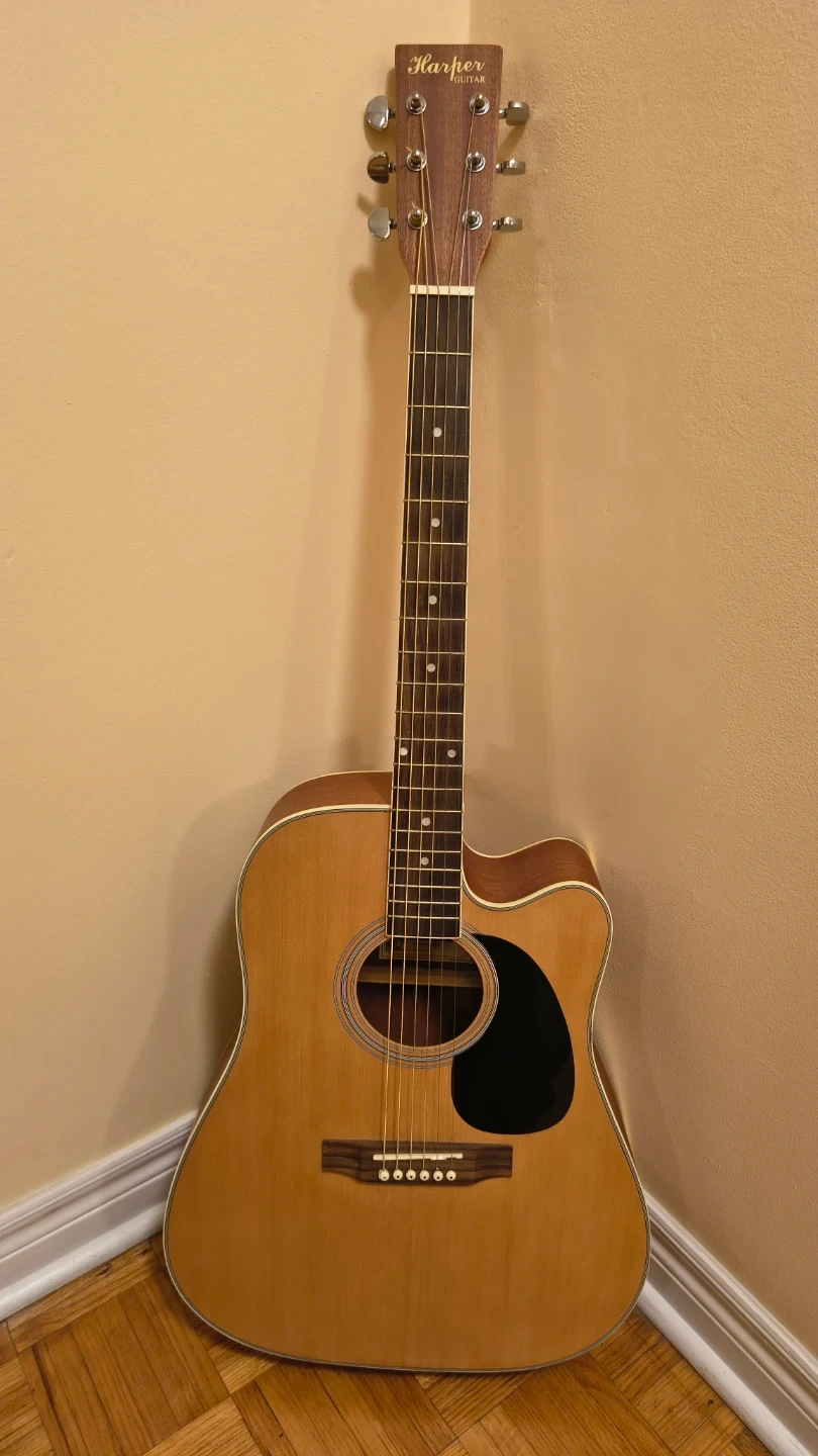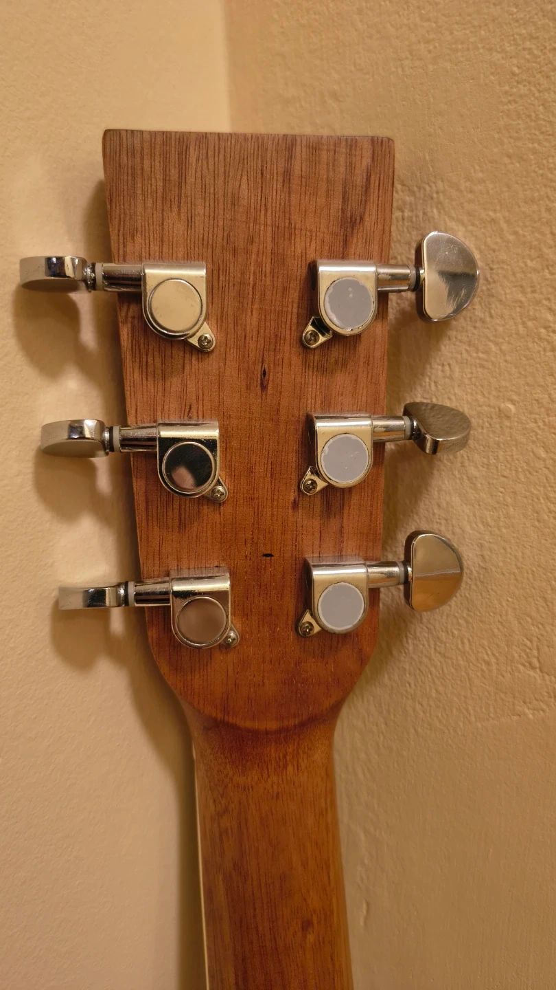 For sale: Nice sounding full size Martin-style guitar with new set of D'Addario strings. Very resonant. Full binding (both body and neck, see the pictures). Quality mahogany wood veneer; minor cosmetic imperfections with no impact on playability/sound.
