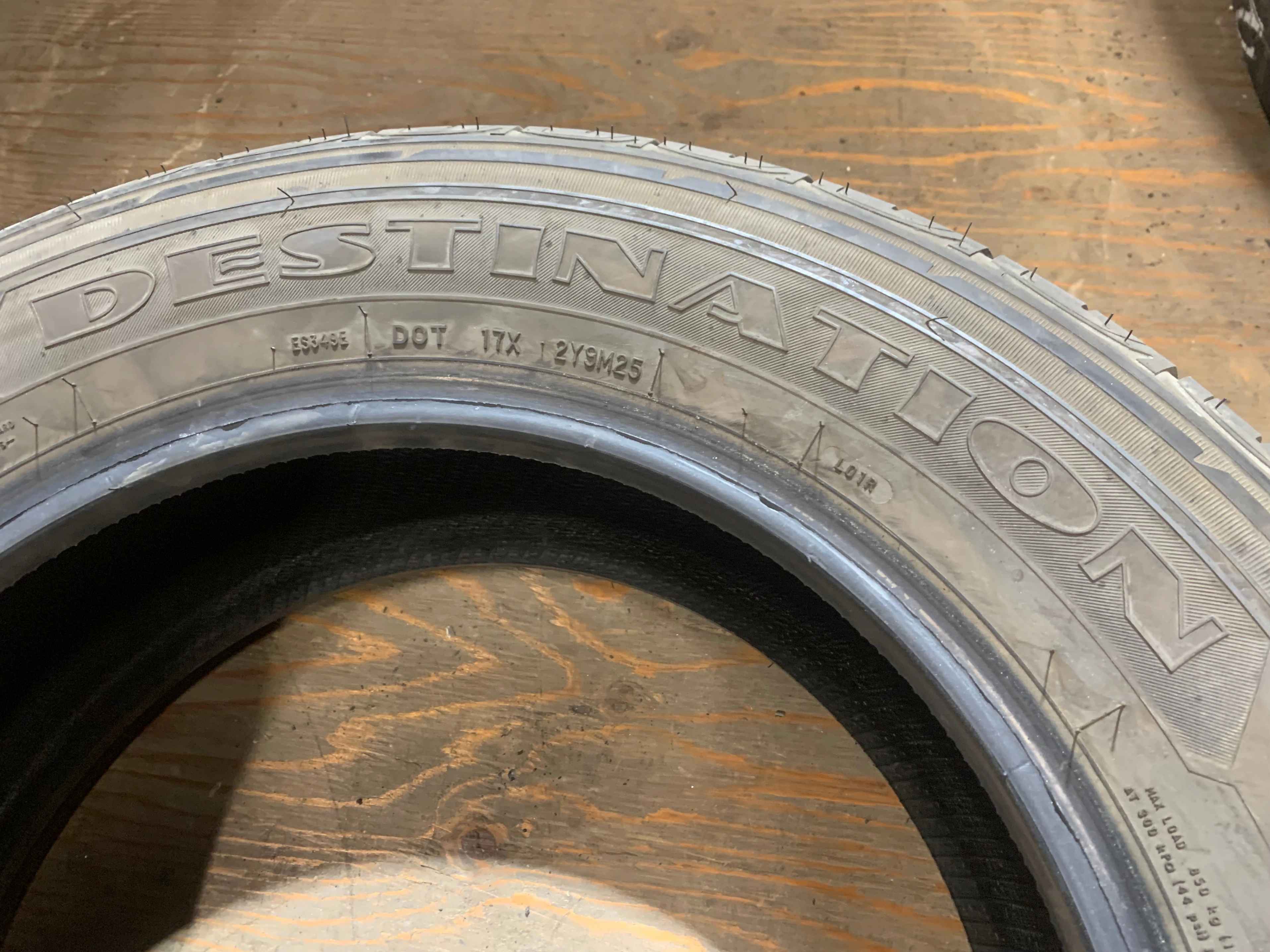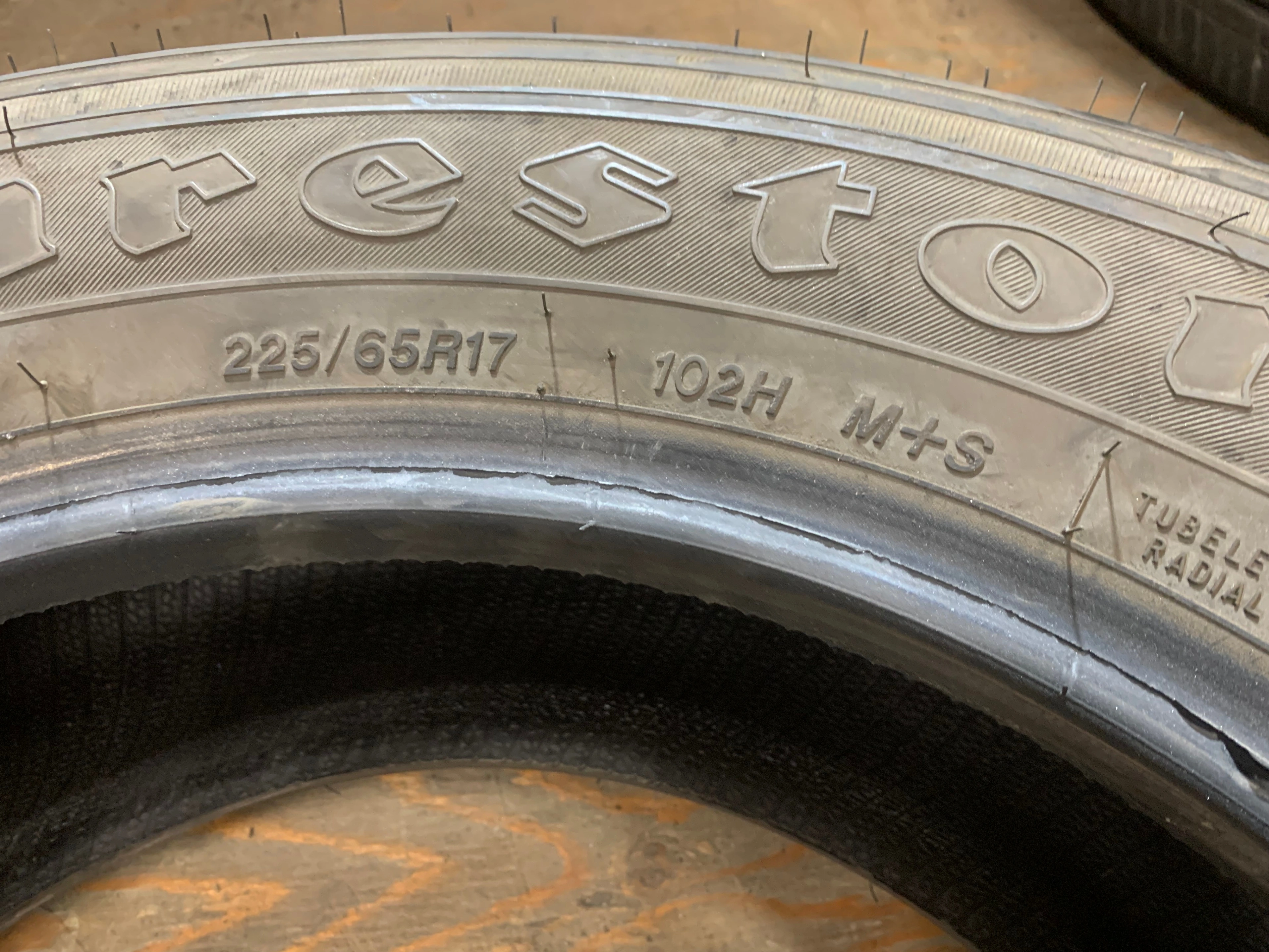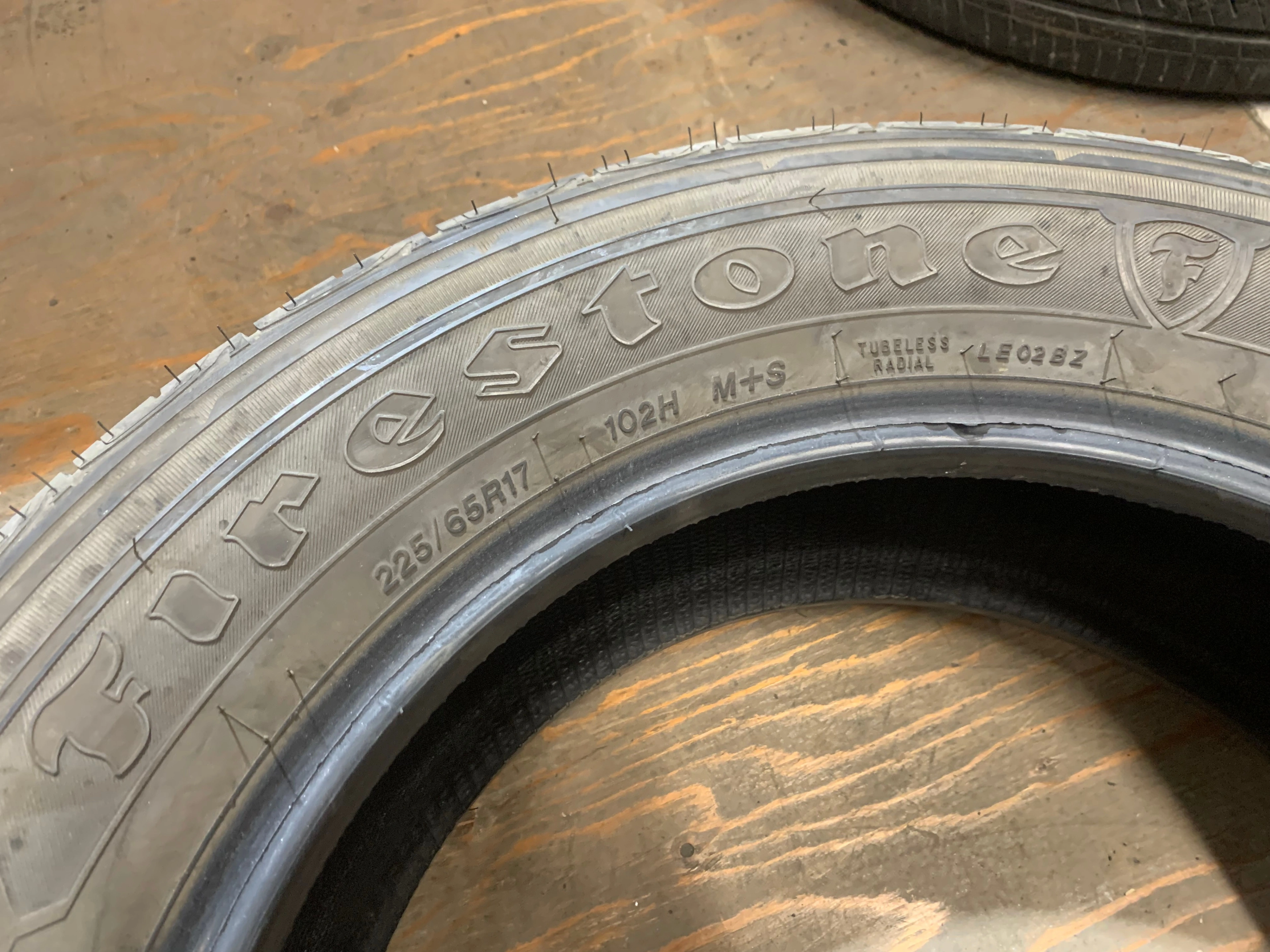 size 225/65/17 102H M+S Firestone Destination LE2 with no repairs and 70% tread