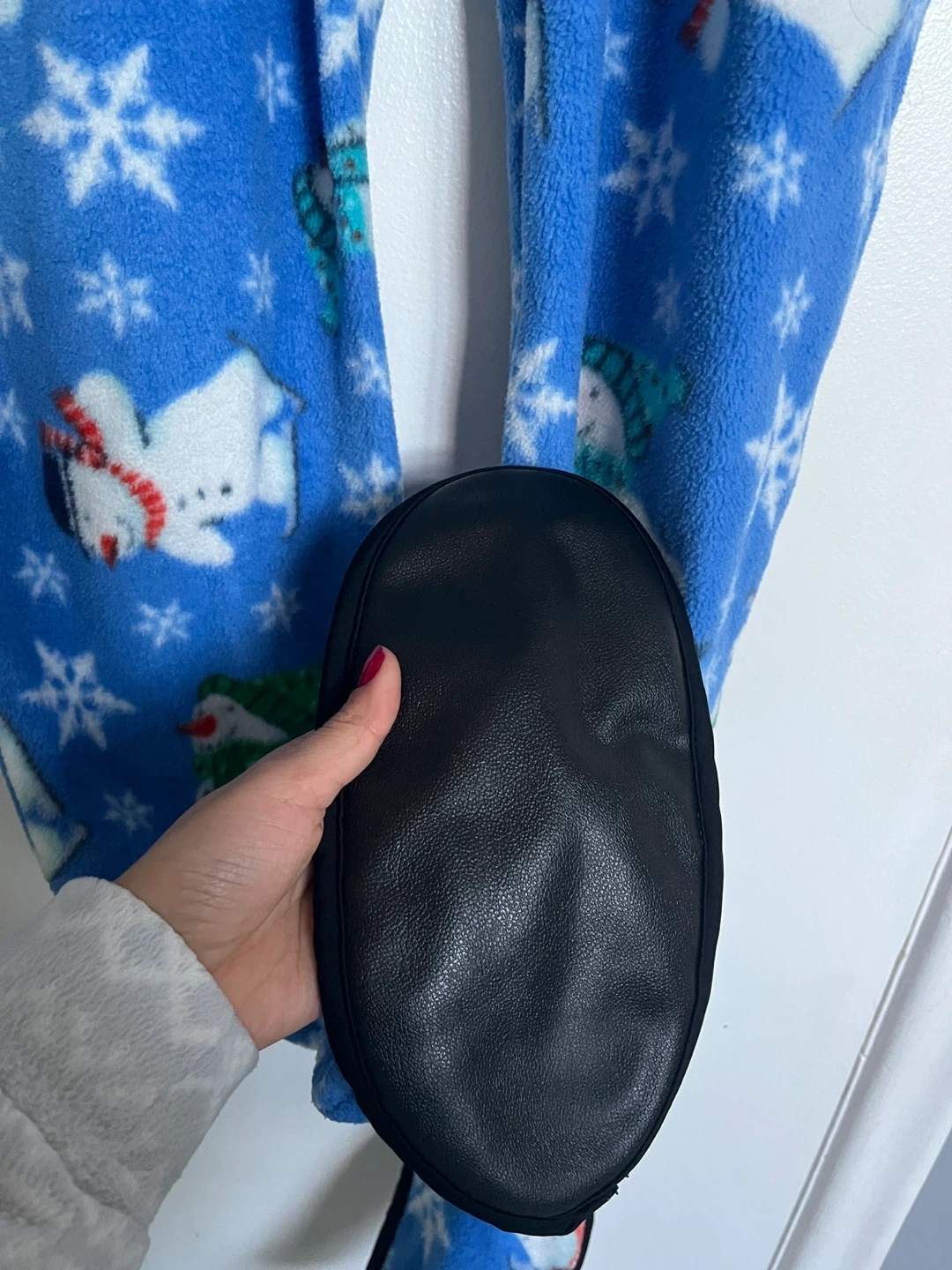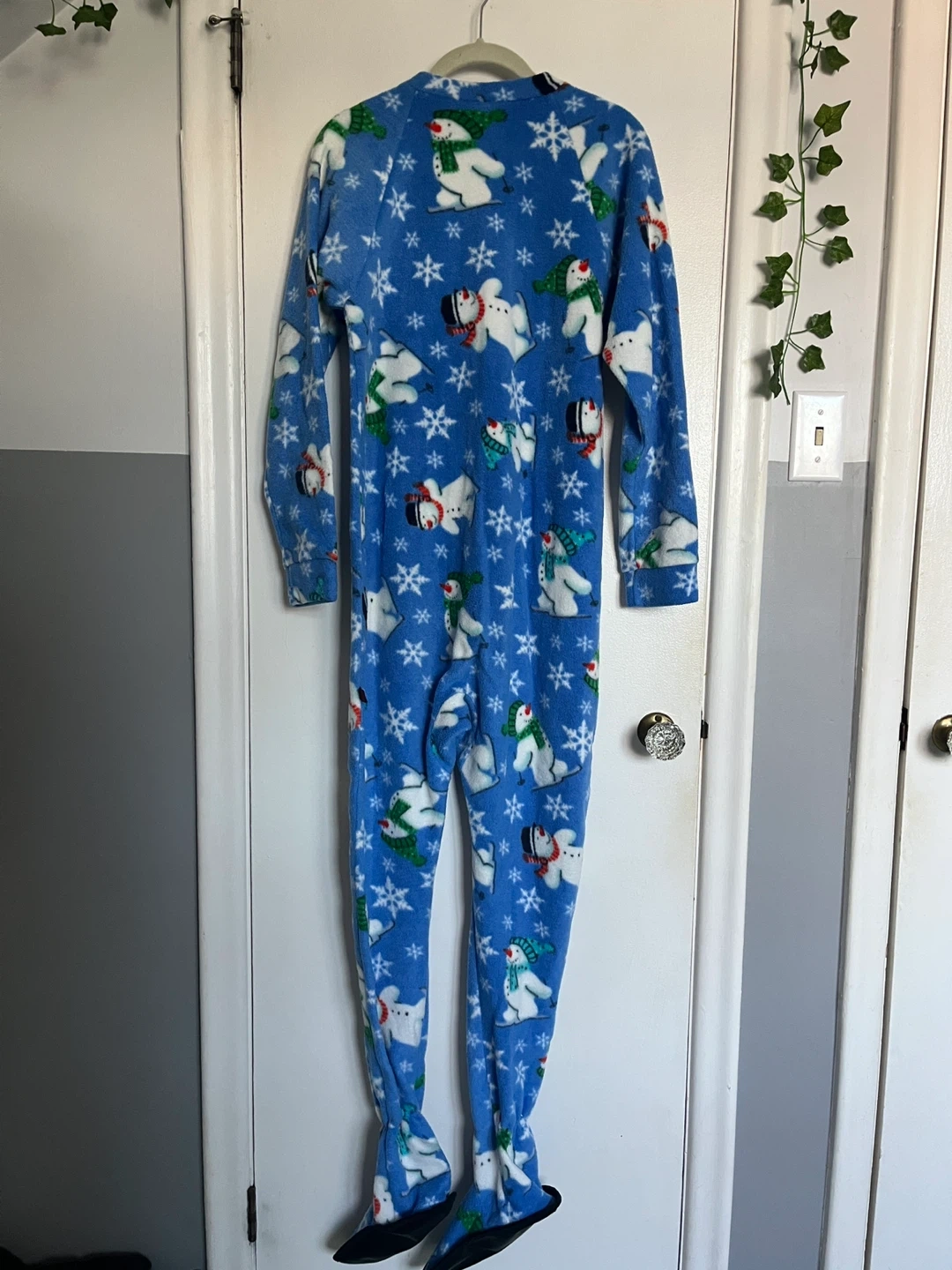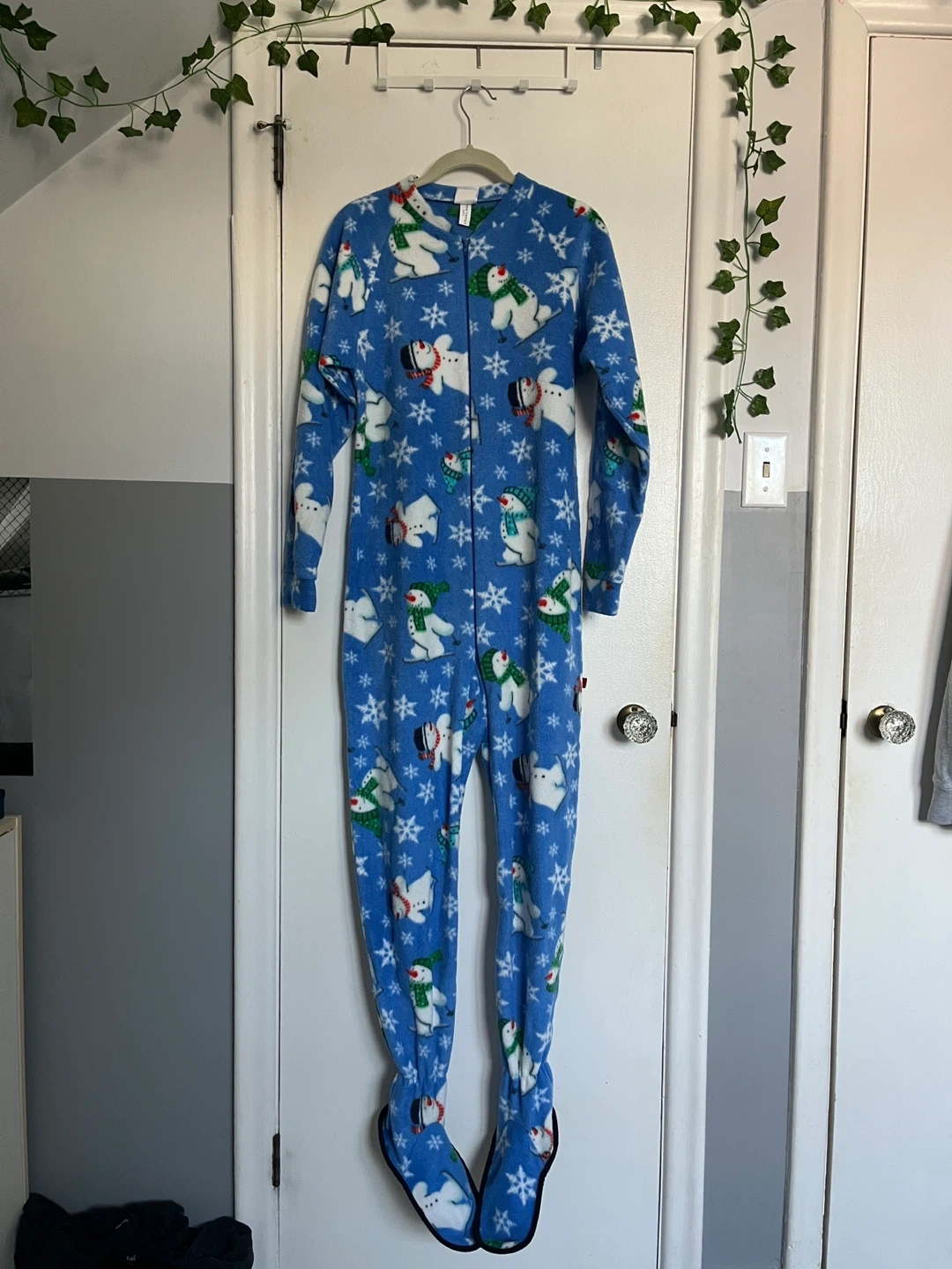 Snug As A Bug onesie in adult size small! It's blue with a cute snowman and snowflake pattern. Perfect for cozy nights in or a fun winter pj outfit!