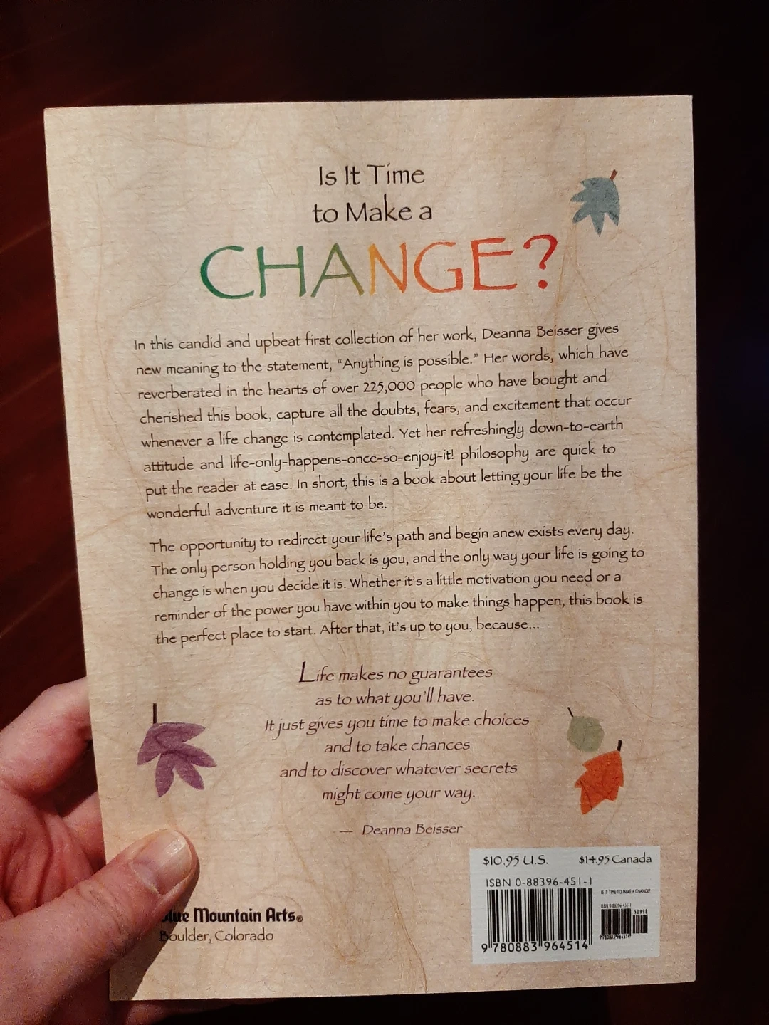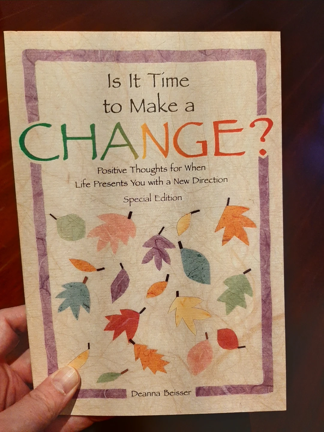 I'm selling a new copy of 'Is It Time to Make a Change?' by Deanna Beisser. It's a special edition filled with positive thoughts for when life presents you with a new direction. A great read for anyone looking for a bit of inspiration and motivation!
