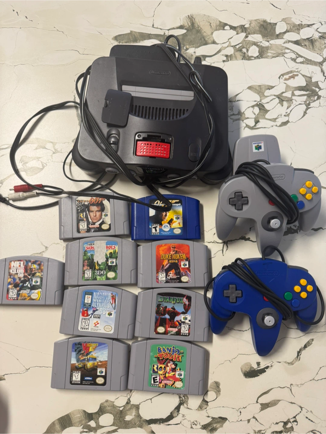 Selling a Nintendo 64 console with a bunch of games! Includes the console, controllers, and a selection of classic N64 games like NFL Quarterback Club 98, GoldenEye 007, Duke Nukem 64, Star Fox 64, and more