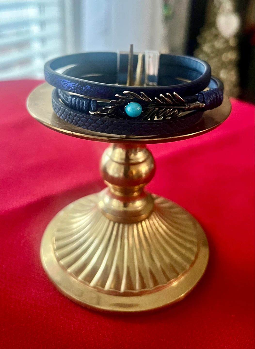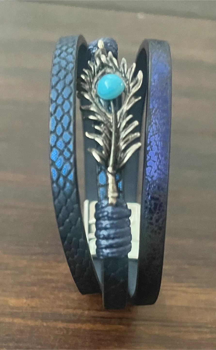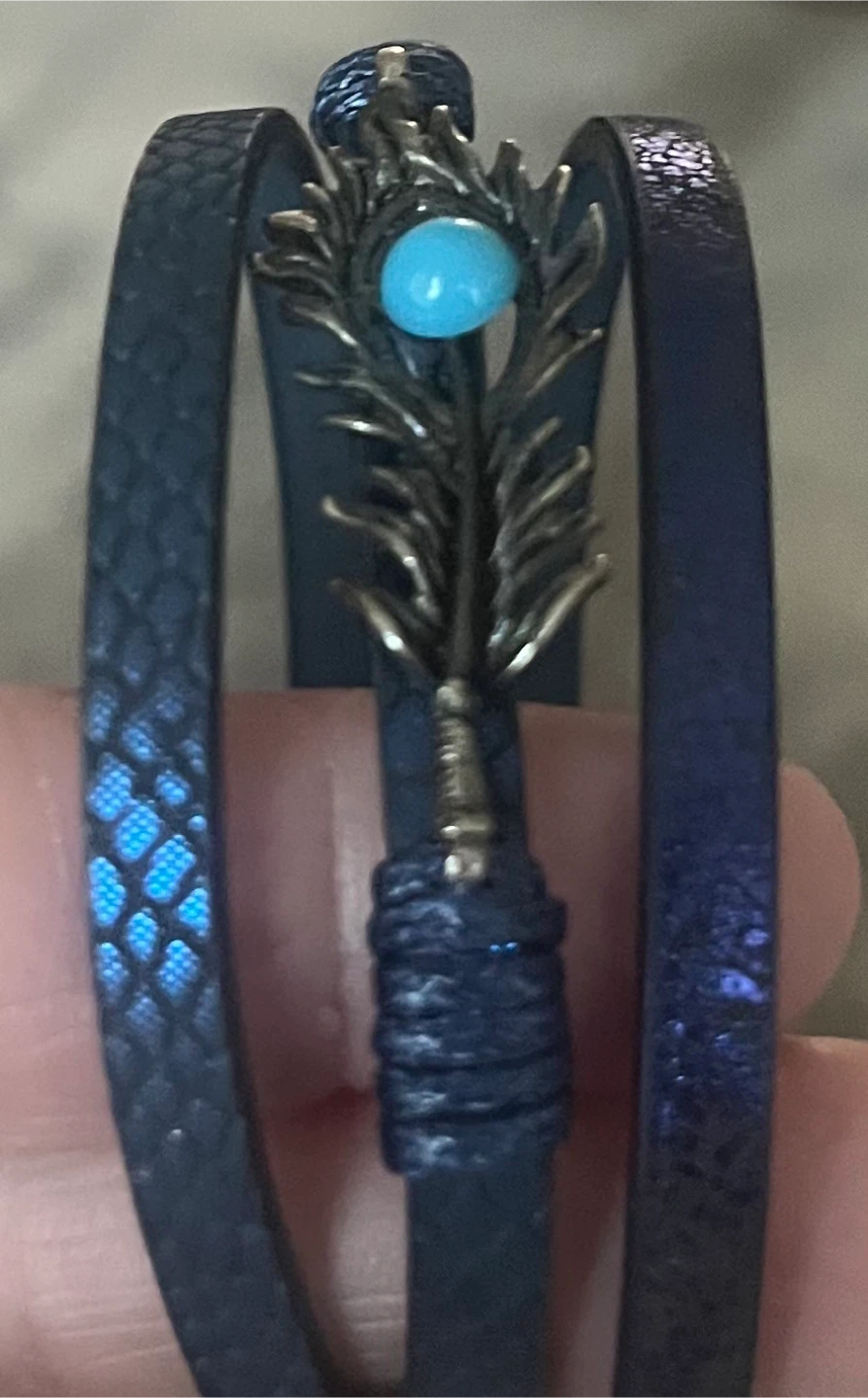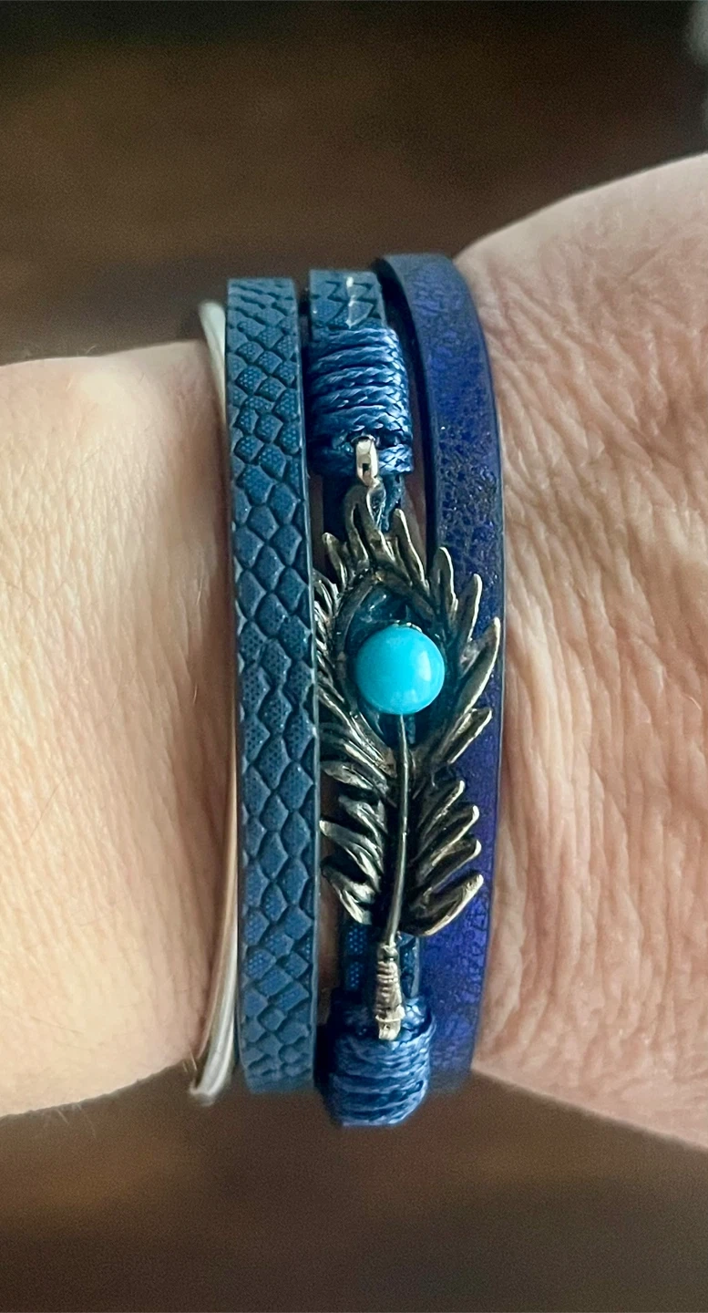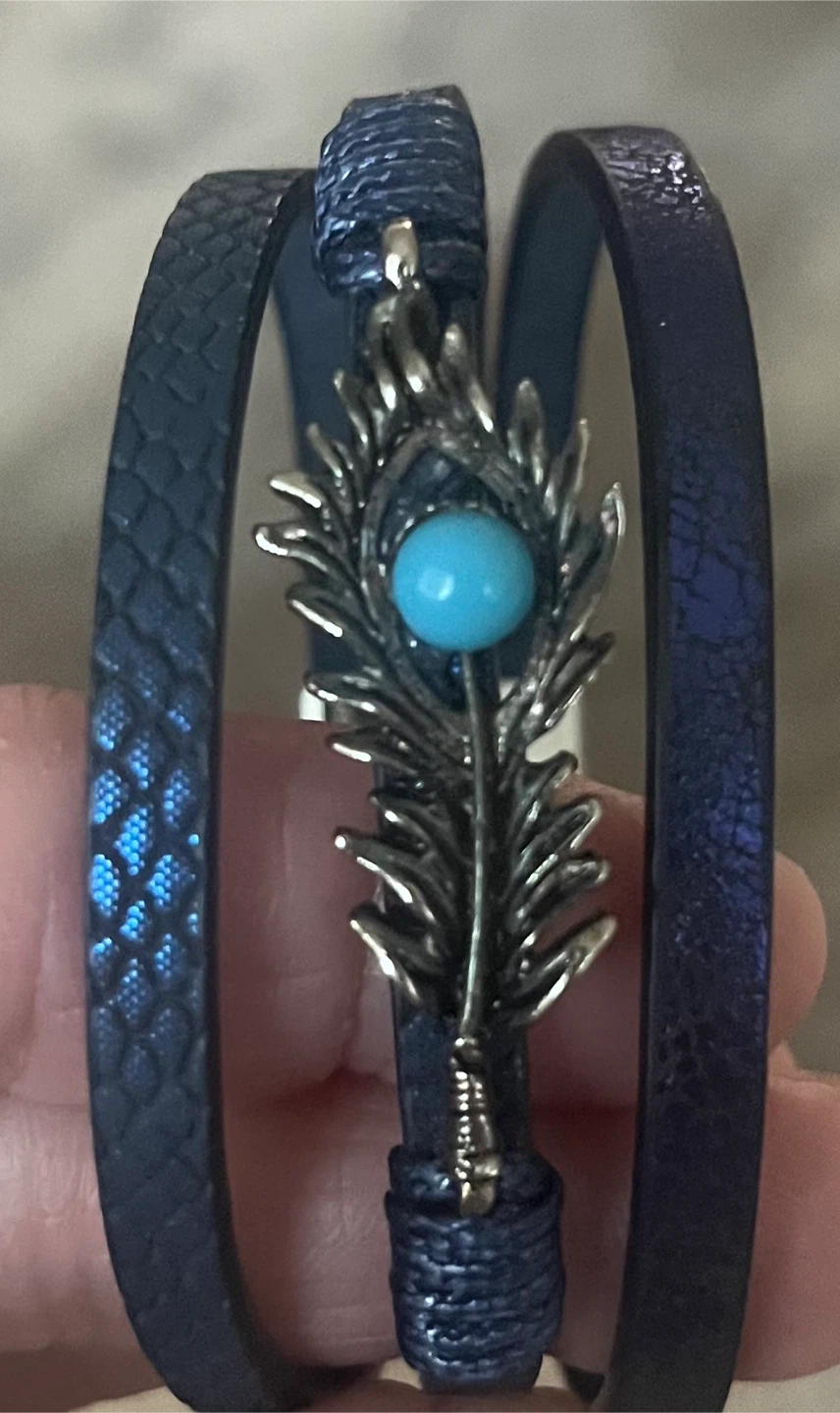 This is a stylish blue leather bracelet with a unique feather accent. It features a beautiful turquoise-coloured stone in the centre of the feather. The bracelet has a multi-strand design, adding to its charm. Perfect for adding a touch of elegance to any outfit!