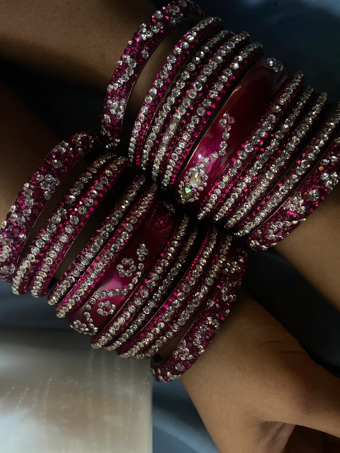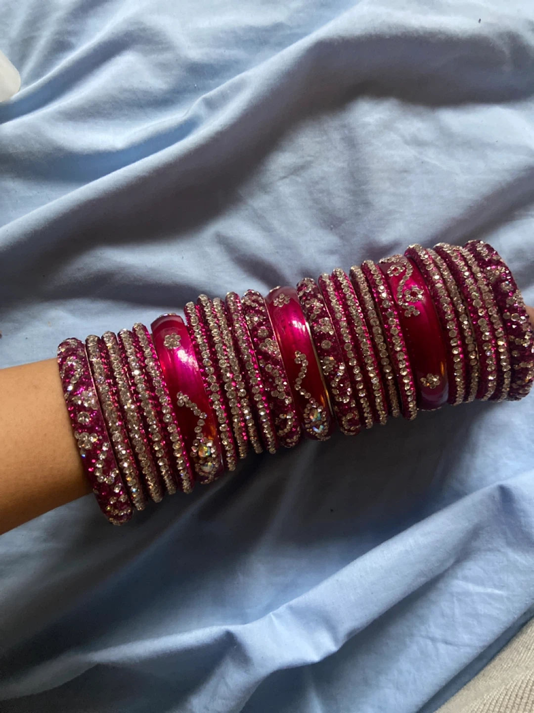Selling a set of pink bangles. They have a beautiful design with sparkling details. Perfect for adding a touch of elegance to any outfit!