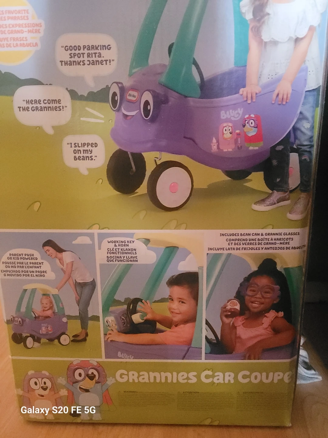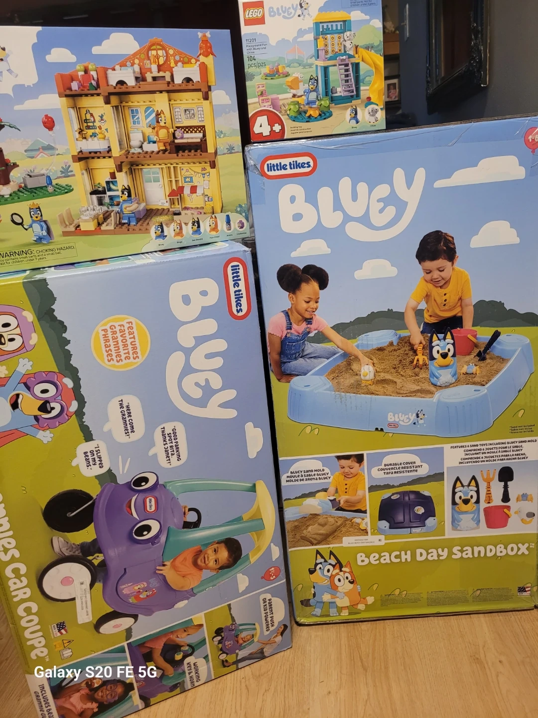Selling a Little Tikes Bluey Grannies Car Coupe! It's a fun ride-on toy for kids. The car features phrases from the show, like "Here come the grannies!" and "Good parking spot Rita, thanks Janet!". Includes bean can & grannie glasses.Also bluey sandbox with pails and digging tools. With this set there I'd also 2 lego sets. Asking 250 obo