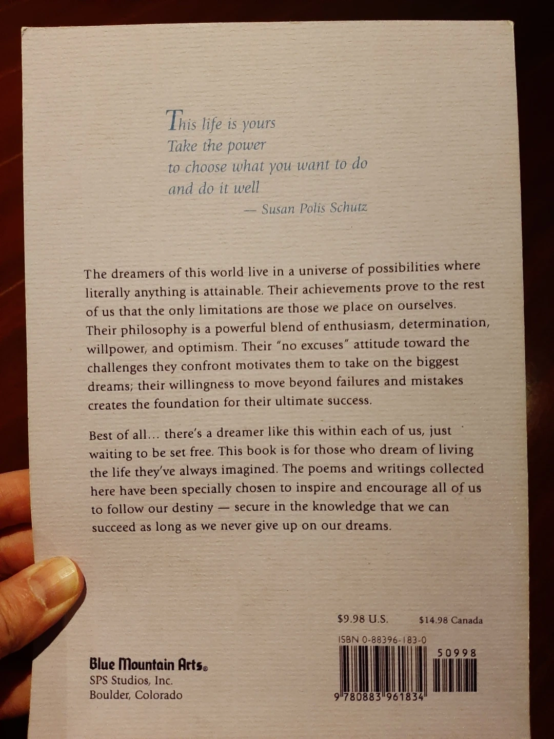 Selling a Blue Mountain Arts collection book called 'Don't Ever Give Up Your Dreams'! It's a collection of poems and writings to inspire and encourage you to follow your dreams. A nice little book to have around! Excellent condition.