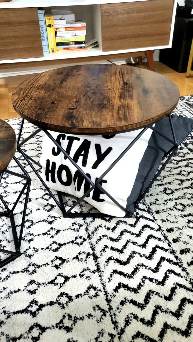 This set is brand new and still in box, no damage or dent. Pictures are mine, but I have extra. Rustic brown wood finish of the shelf which can be lifted up for storage. The original price was $285 plus tax, so save $$. Price is not negotiable, please don't ask to lower it. See dimensions in one of the pics.