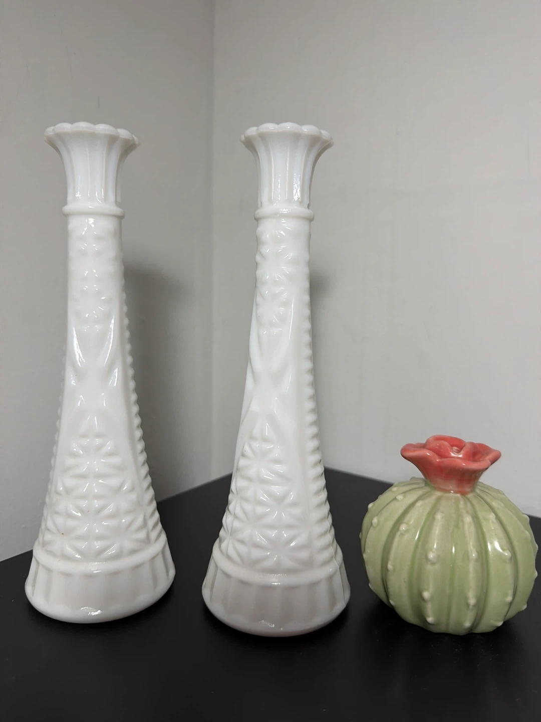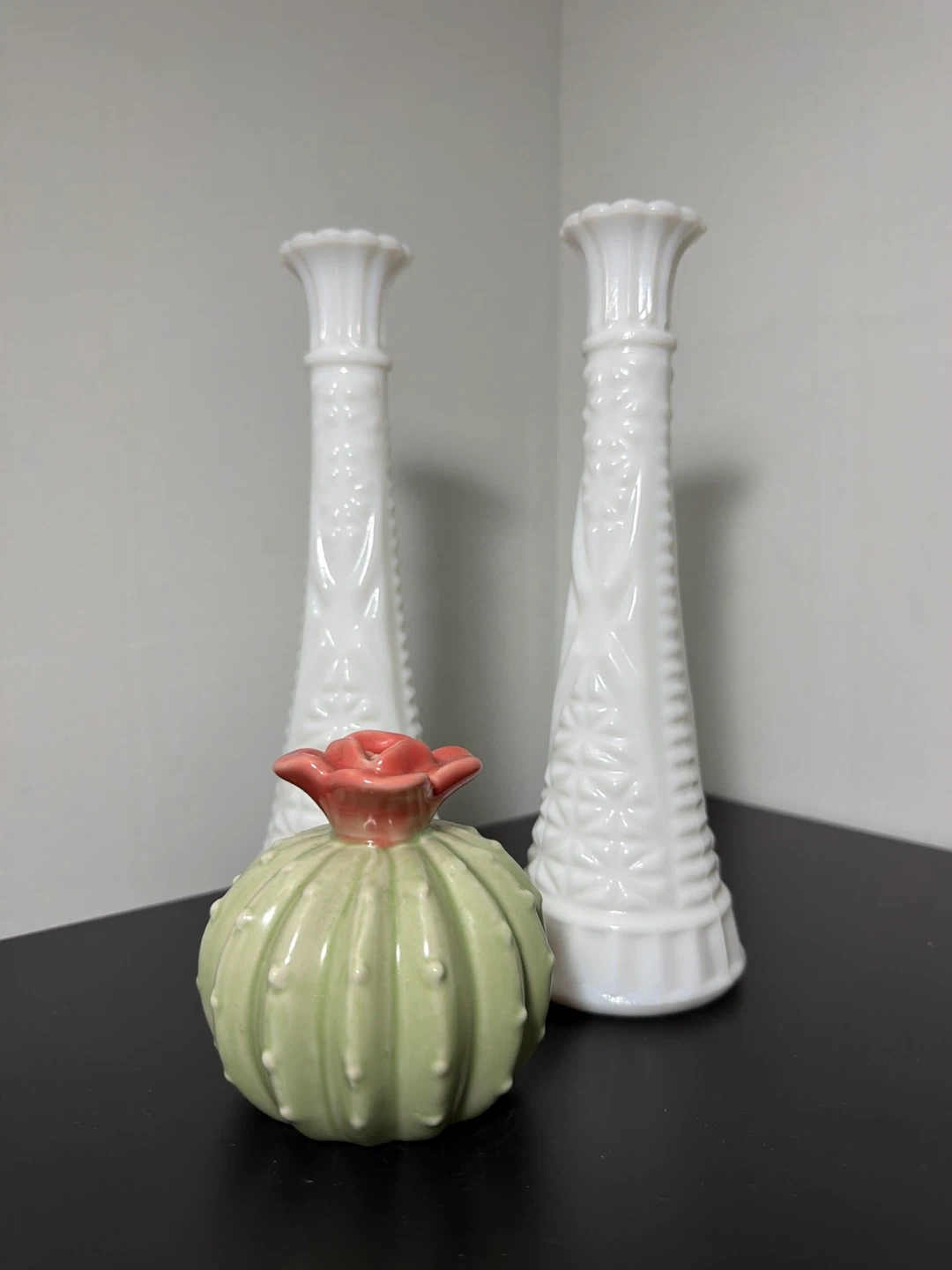 Selling a set of two milk glass vases and a cute cactus decor piece! They're in great condition and would look lovely in any room. Perfect for adding a touch of vintage charm to your home