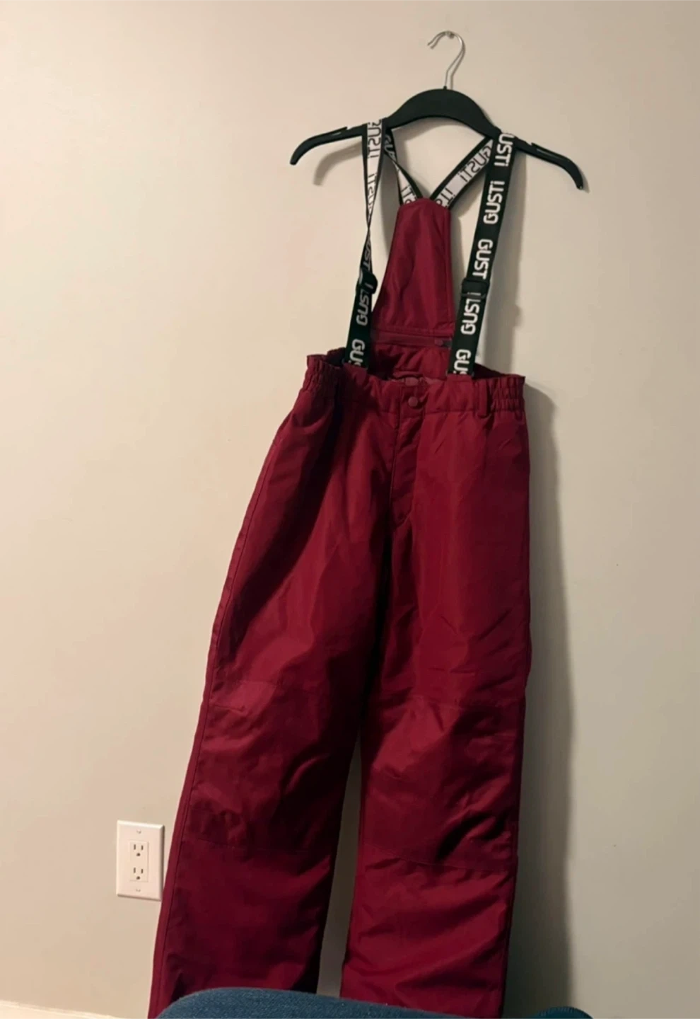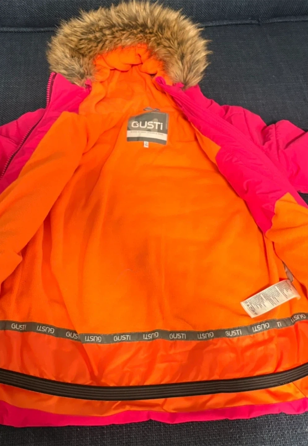 SIZE 14, BRAND NEW! Gusti winter set, including a bright pink jacket with a faux fur hood and burgundy snow pants with adjustable suspenders. The jacket is size XL. Perfect for staying warm and stylish this winter season!