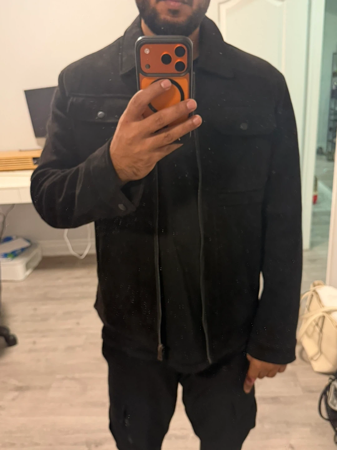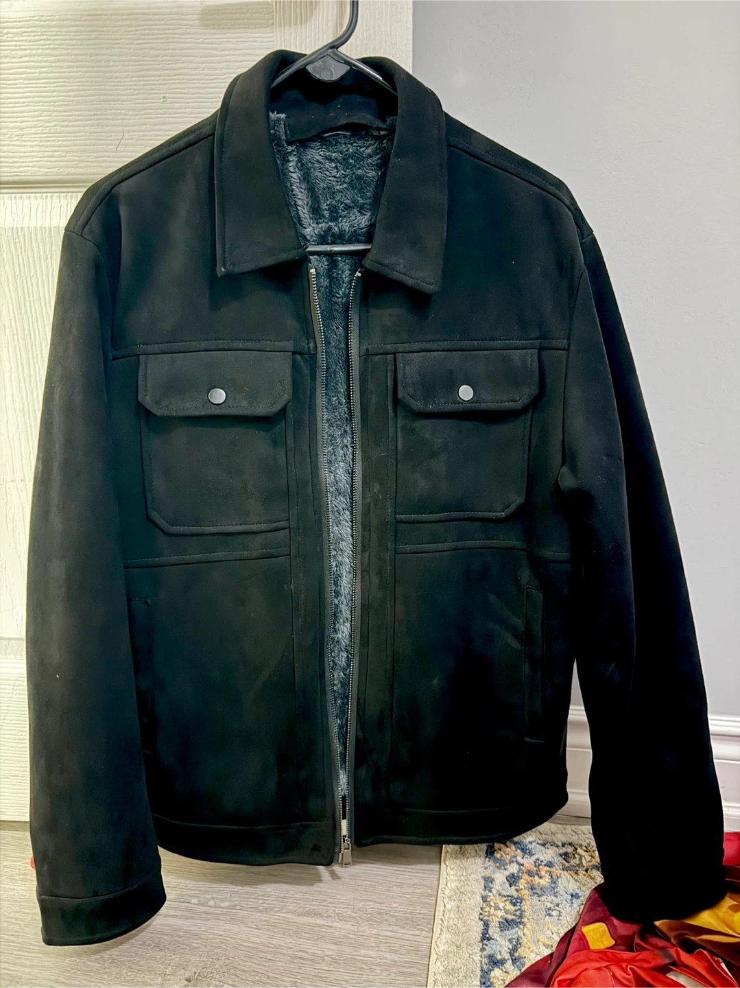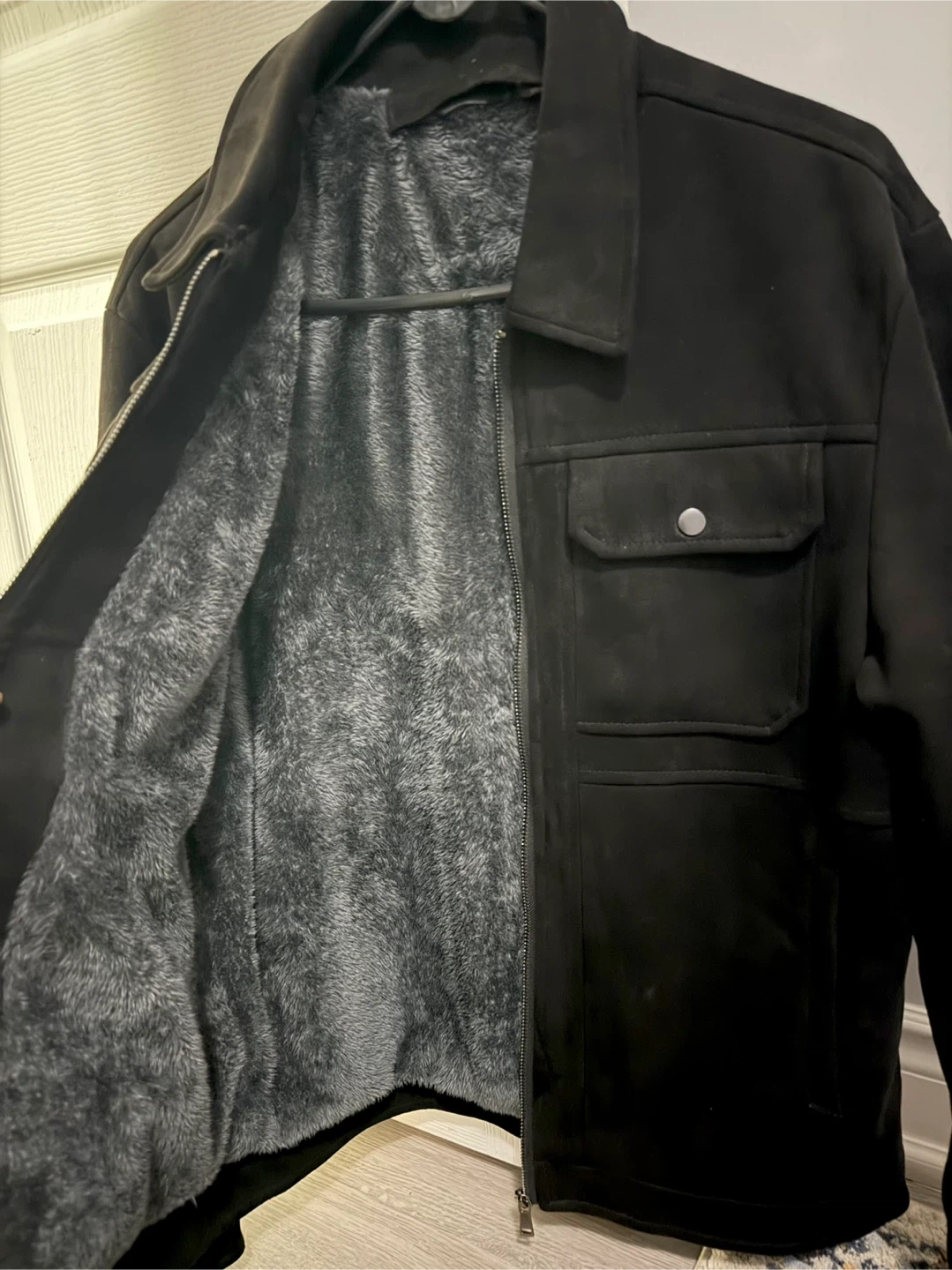 Selling a black jacket with a cozy fur lining. It's in great condition and perfect for staying warm during the colder months. The jacket features a classic design with a zip-up front and pockets.