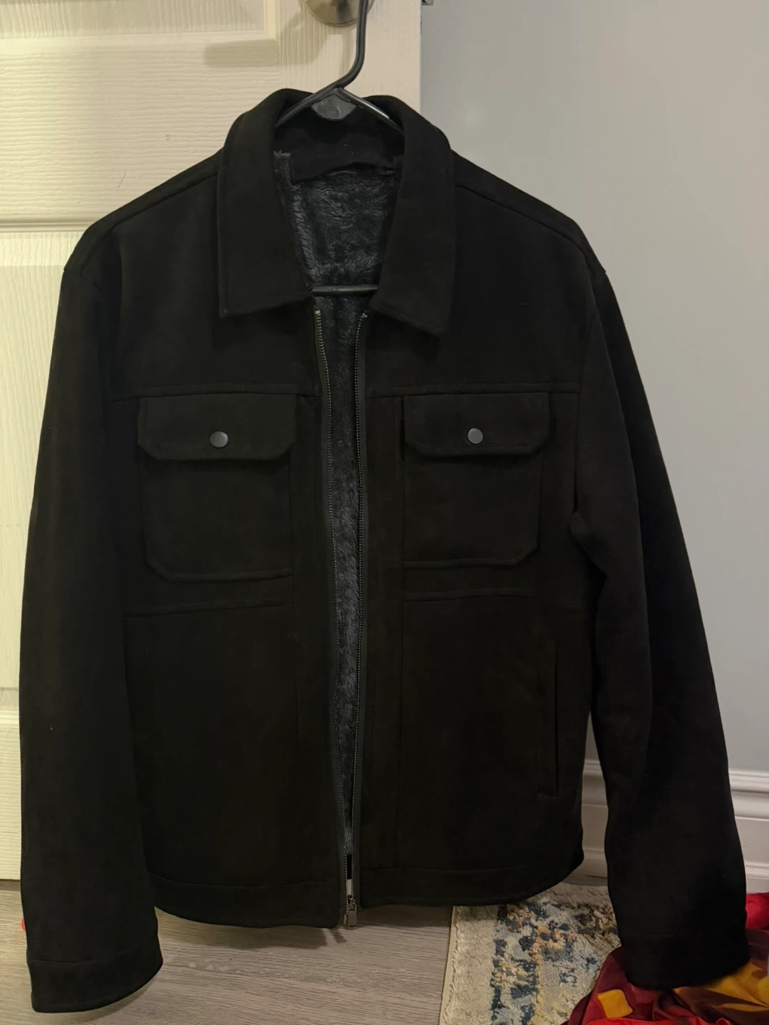 Selling a black jacket with a cozy fur lining. It's in great condition and perfect for staying warm during the colder months. The jacket features a classic design with a zip-up front and pockets.