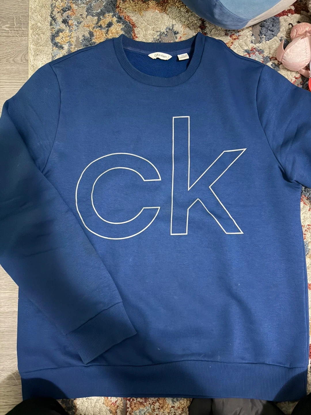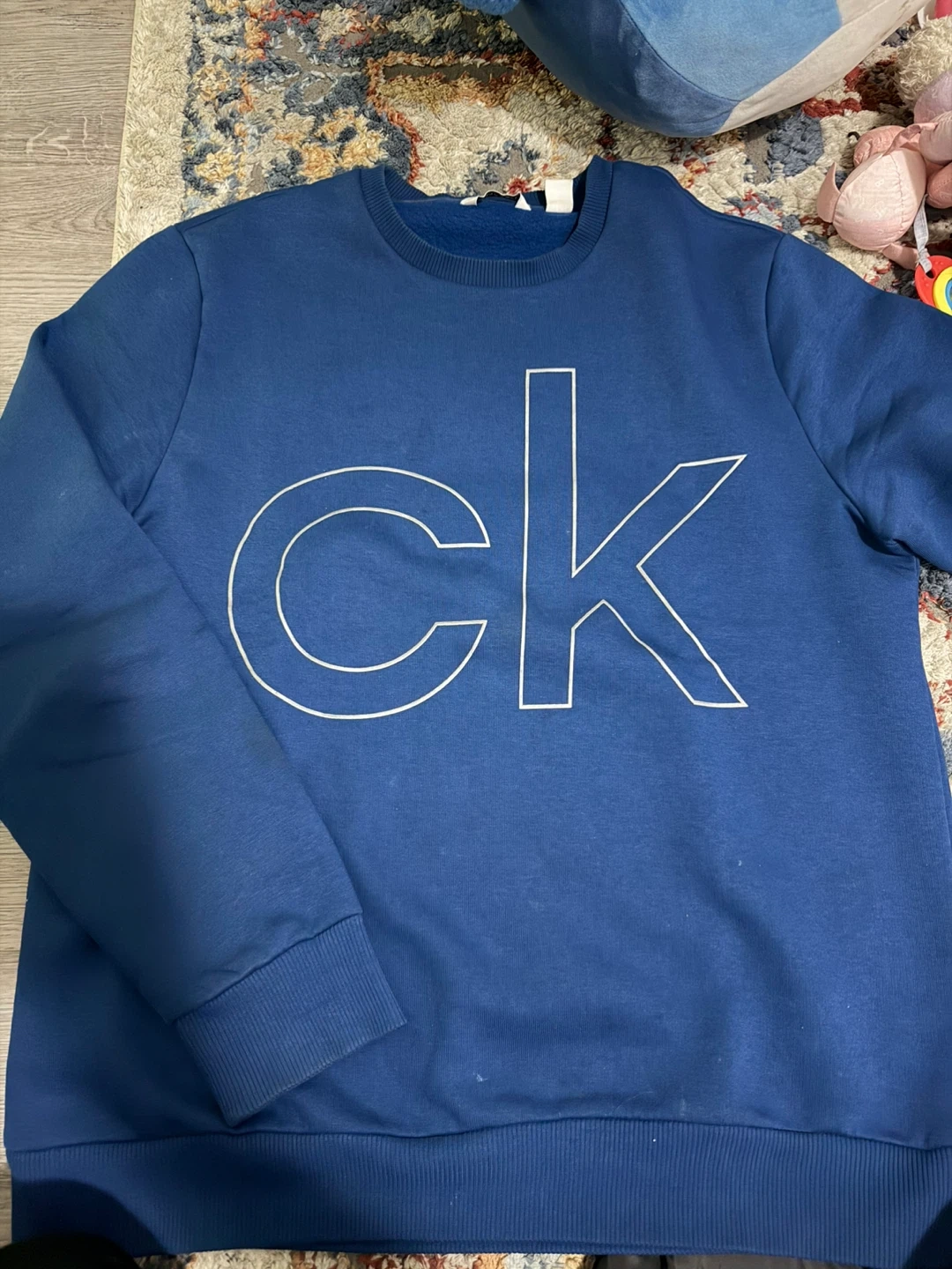 Selling a Calvin Klein crewneck sweatshirt in blue. It's in great condition and features the iconic 'ck' logo on the front. Perfect for a casual and comfy look!