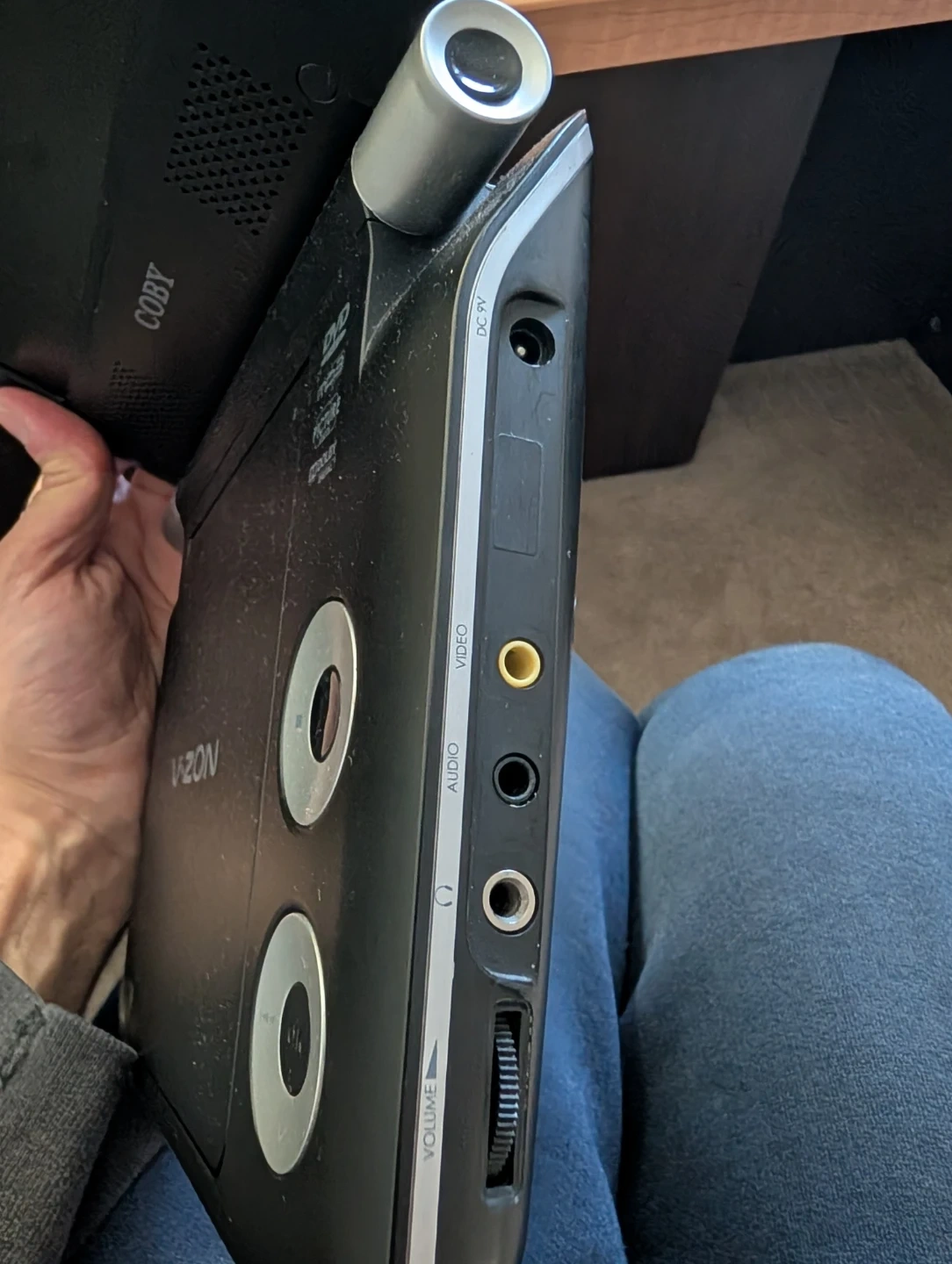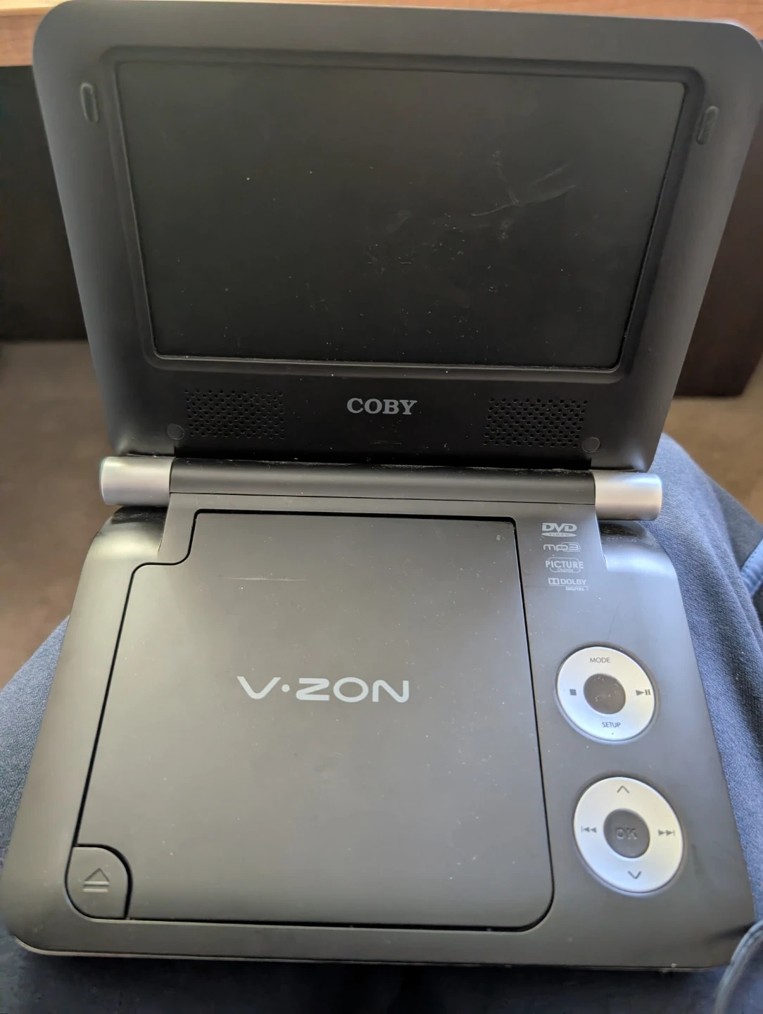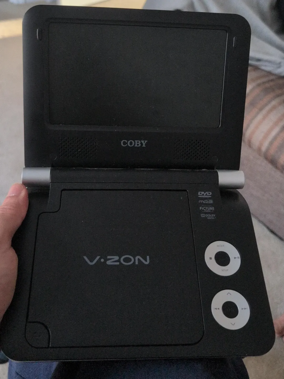 Selling a Coby V.ZON portable DVD player. It plays DVDs and also supports mp3 and picture formats. It's in good condition and ready for your next road trip or quiet time at home