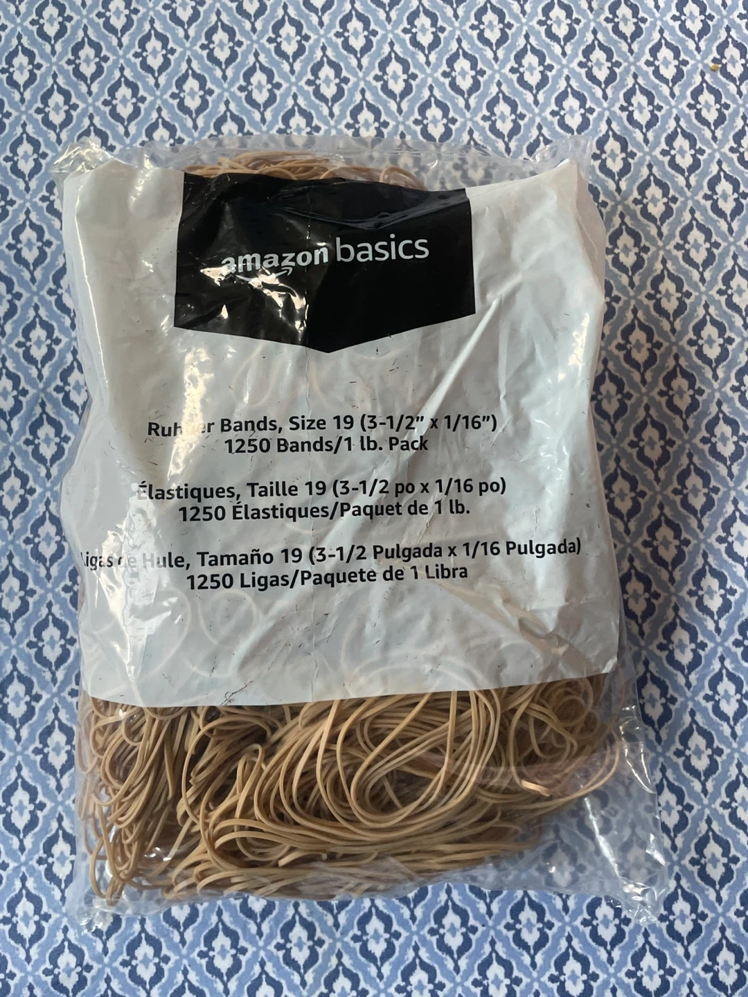 Selling a pack of Amazon Basics rubber bands. They are size 19 (3-1/2" x 1/16") and come with 1250 bands in a 1 lb pack! Perfect for all your organizational needs