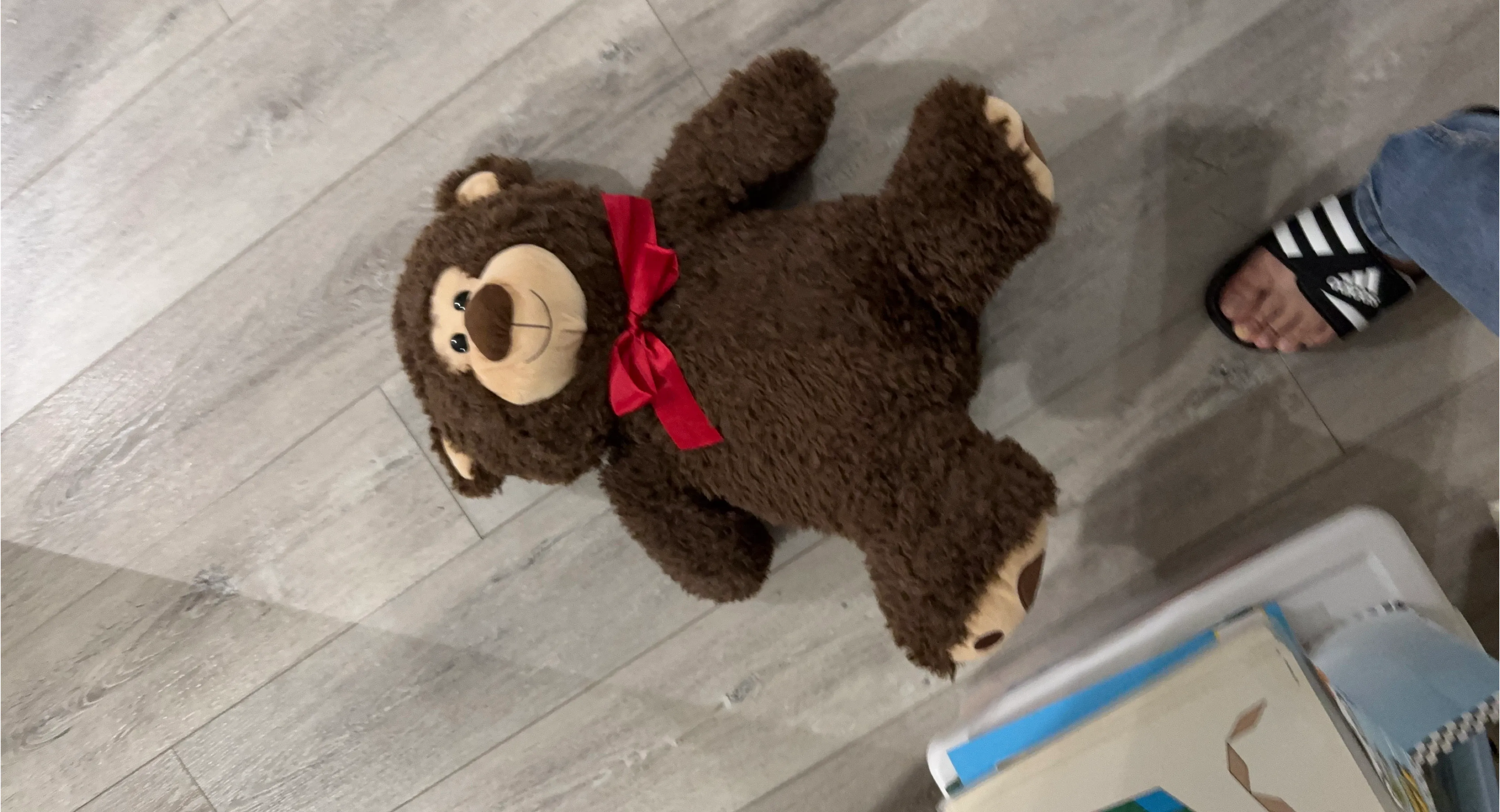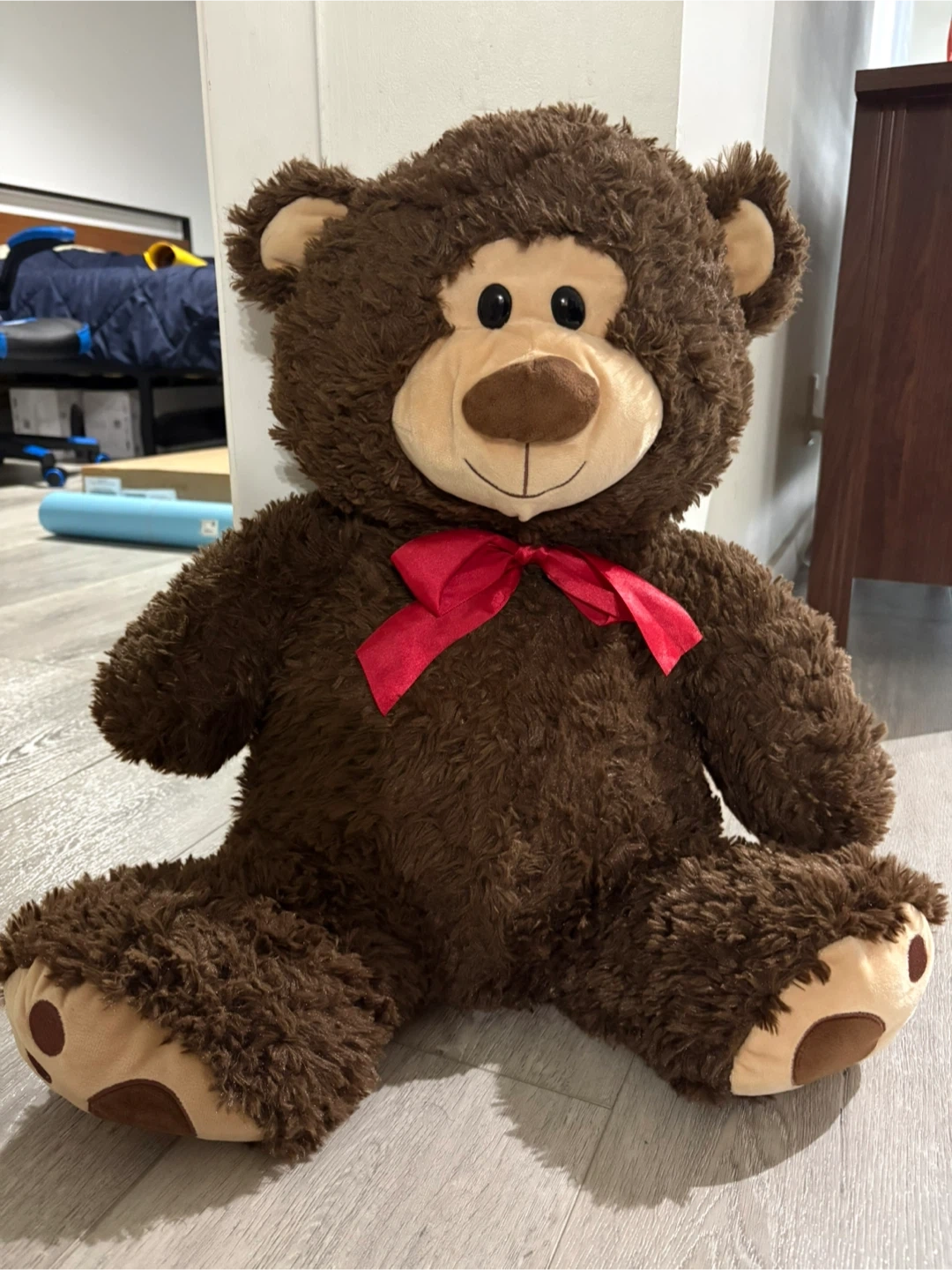A cute and cuddly brown plush teddy bear is up for grabs! It features a soft, fluffy texture and a charming red ribbon around its neck. Perfect for snuggling or as a decorative piece