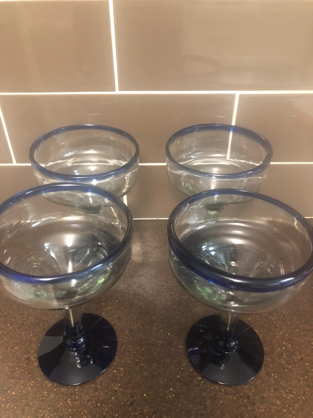 Selling a set of four margarita glasses. They feature a clear glass bowl with a stylish blue rim and a blue base. Perfect for your next fiesta or cocktail night!