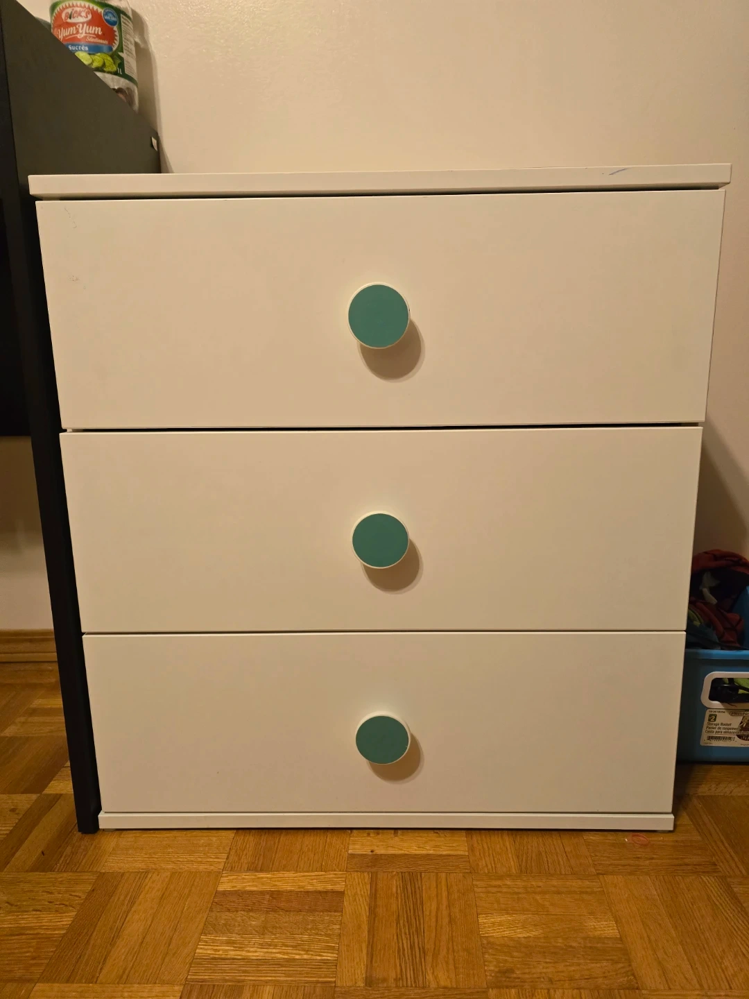 Here's a simple and clean white dresser with three drawers. It has cute green knobs that add a pop of colour. Perfect for a bedroom or kids' room for extra storage!