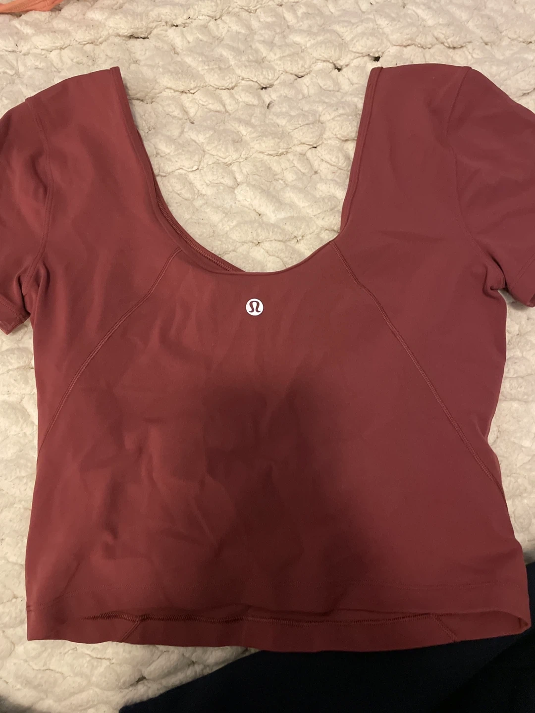Selling a Lululemon Align Cropped Short Sleeve Shirt in a lovely maroon colour. It's in great condition and ready for a new owner!