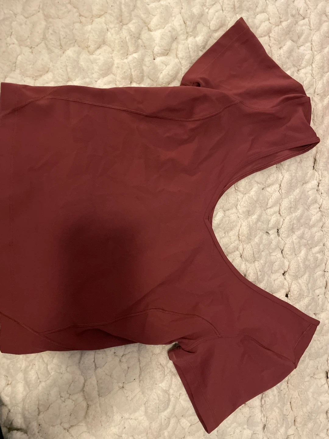 Selling a Lululemon Align Cropped Short Sleeve Shirt in a lovely maroon colour. It's in great condition and ready for a new owner!