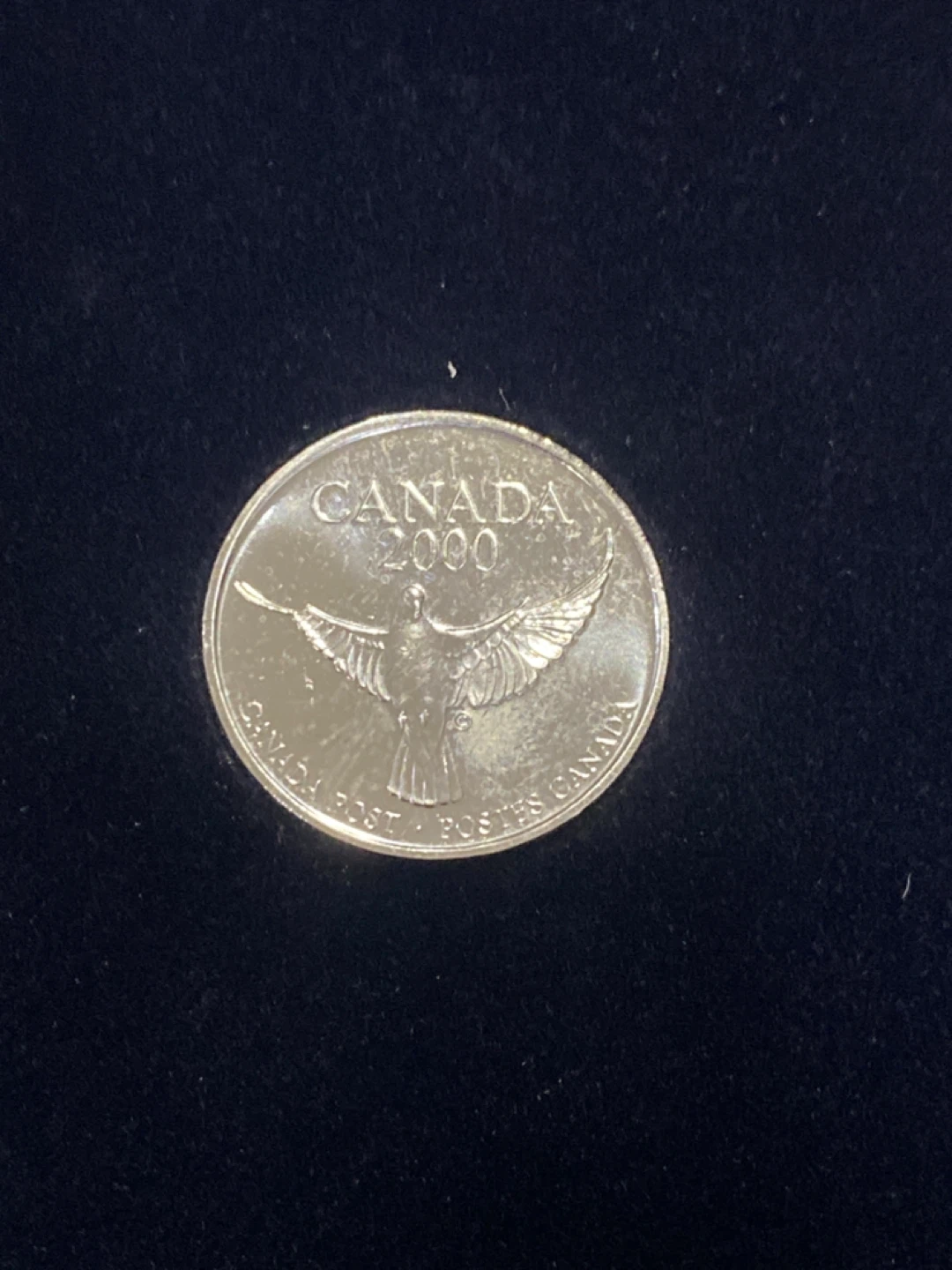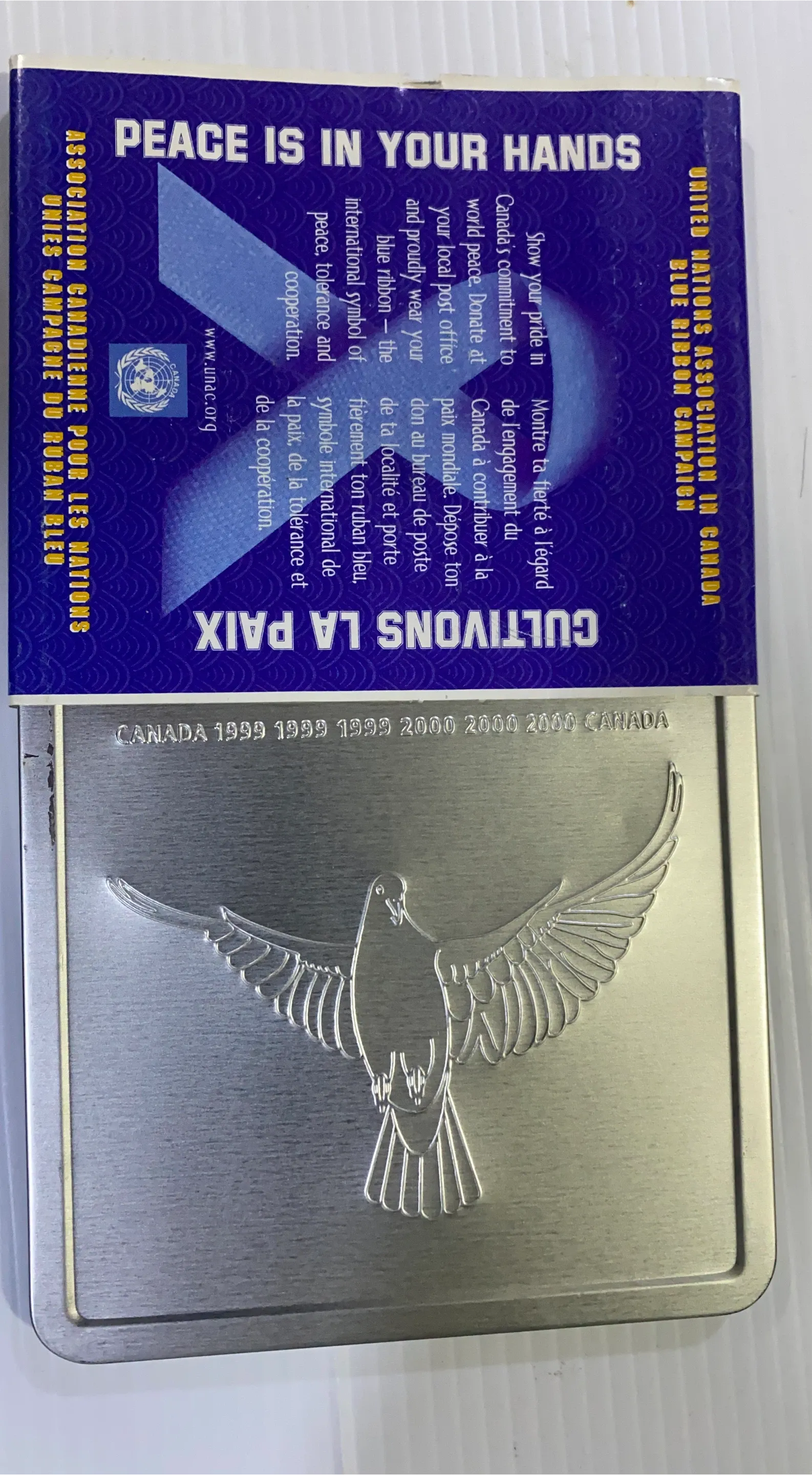 Selling a commemorative coin from the United Nations Association in Canada, promoting peace. The coin features a dove design and the years 1999 and 2000. It comes with its original packaging, which explains the Blue Ribbon Campaign. A nice piece for collectors or anyone interested in supporting peace initiatives