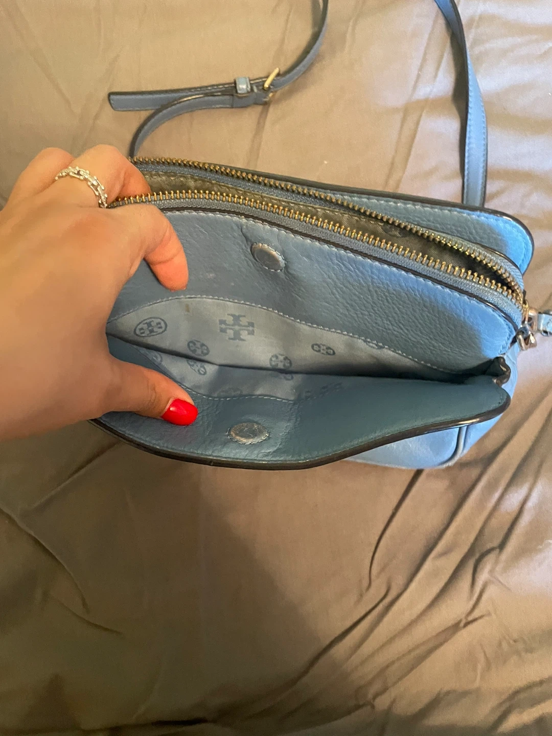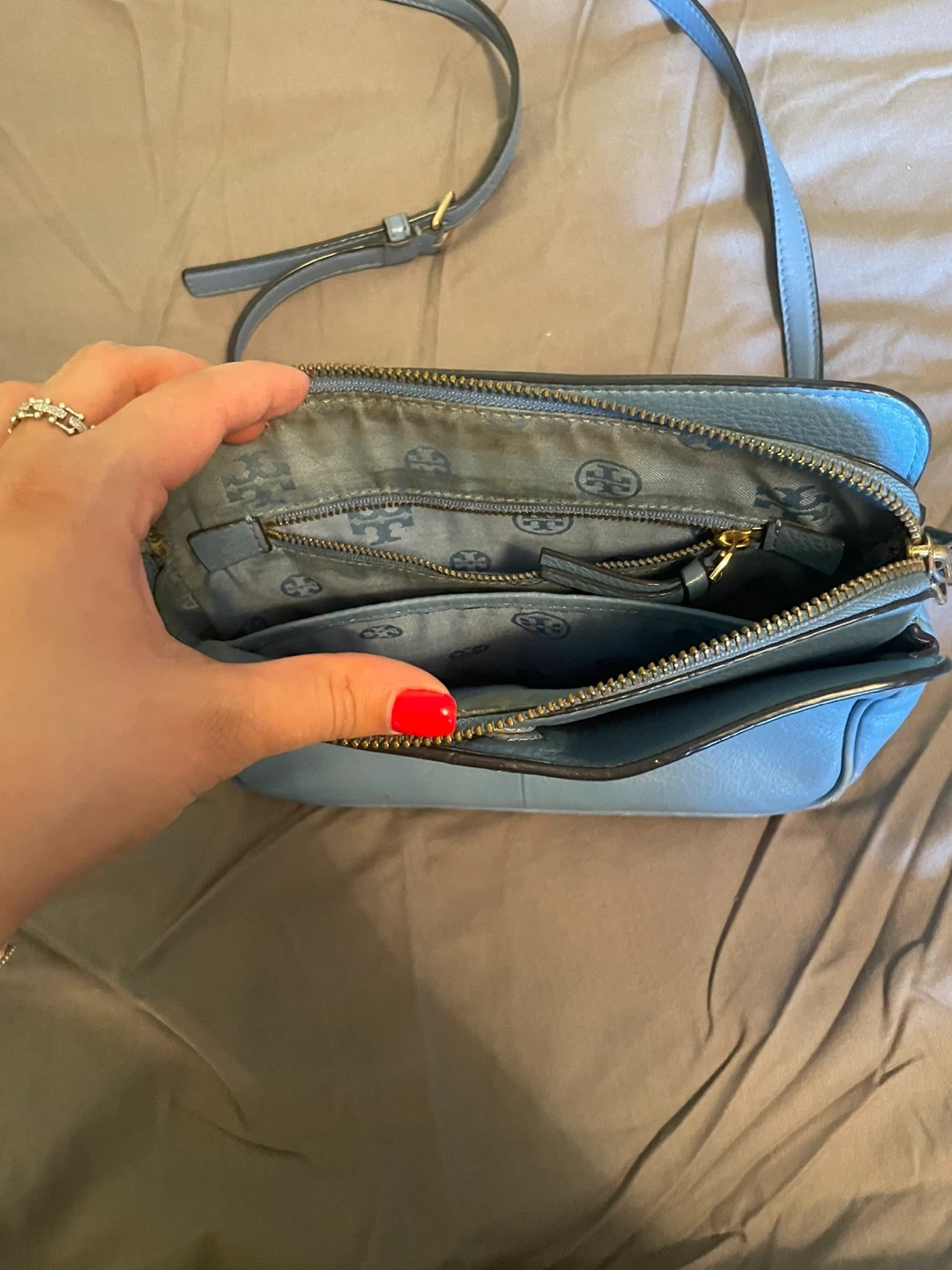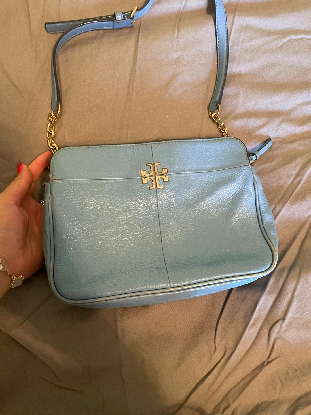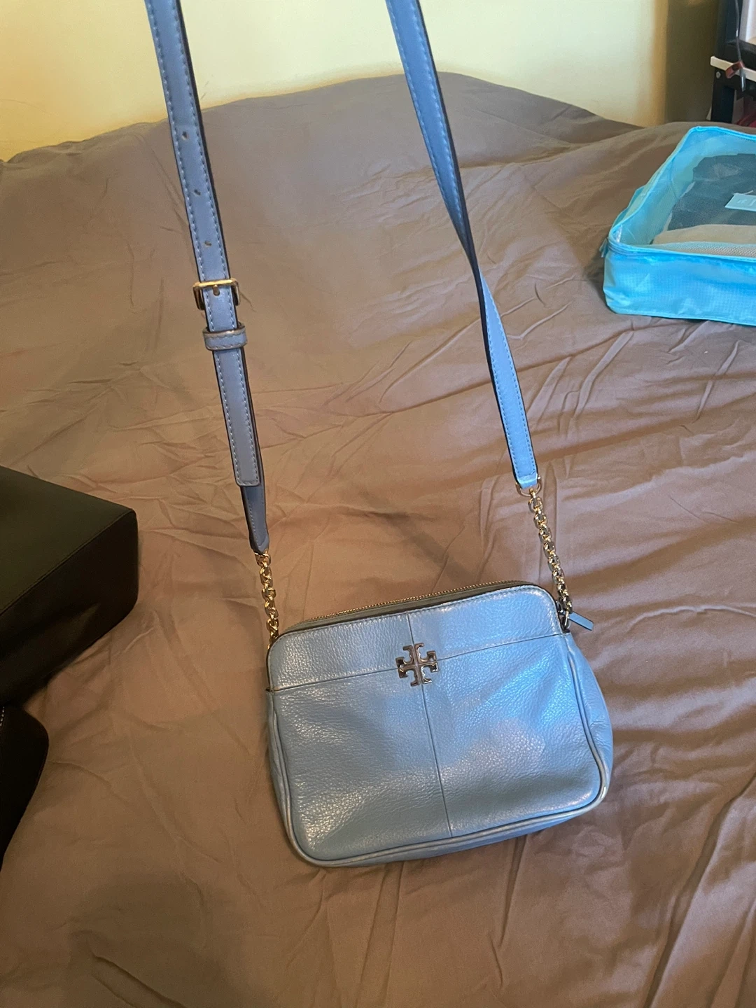 Selling a cute Tory Burch crossbody bag in a lovely blue color! It's made of leather and has the iconic Tory Burch logo. It's in good condition with some signs of wear.