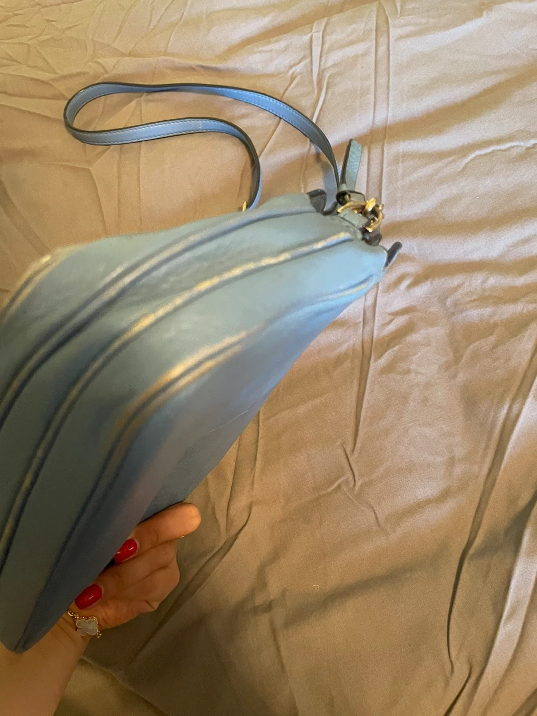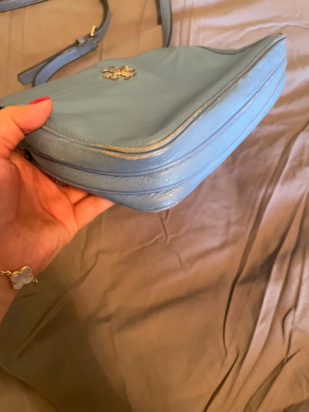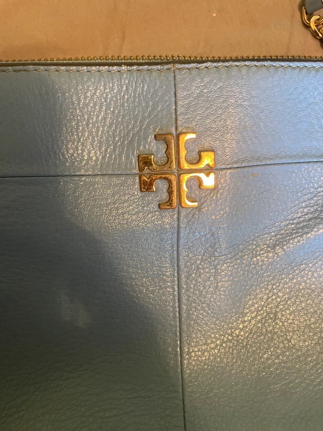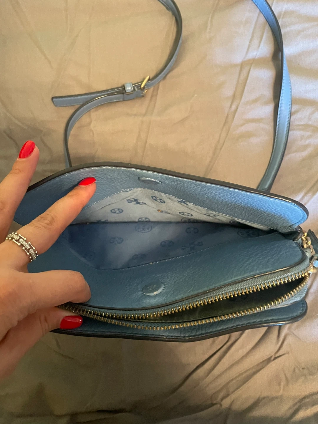 Selling a cute Tory Burch crossbody bag in a lovely blue color! It's made of leather and has the iconic Tory Burch logo. It's in good condition with some signs of wear.