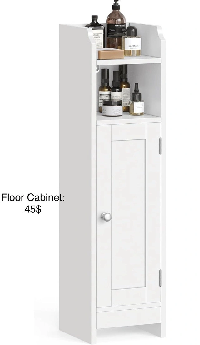This new white floor cabinet offers a blend of style and functionality for your bathroom or any room needing extra storage. Featuring a sleek design with both open shelving and a closed cabinet, it's perfect for organizing essentials. I am asking $85. Features: - Colour: White - Compact design - Material: Wood