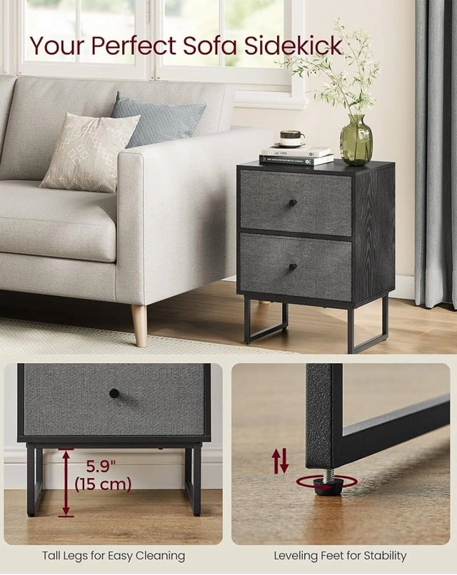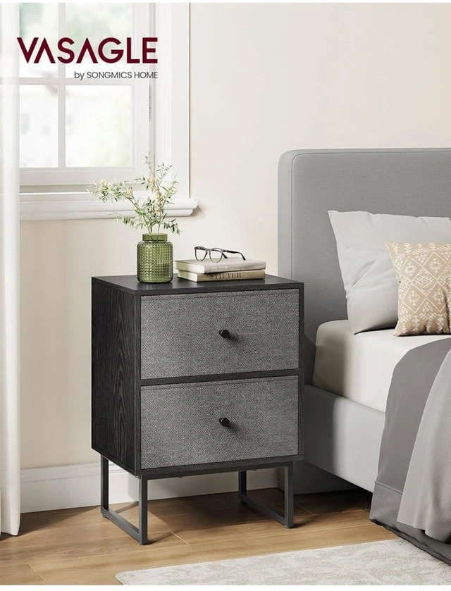 These VASAGLE nightstands are brand new and come as a set of two, perfect as side tables for your couch or bedside. They feature two fabric drawers, offering a blend of style and functionality. Approximate dimensions are 21.7" (55 cm) in height, 15.7" (40 cm) in width and 11.8" (30 cm) in depth. Each drawer is approximately 7.1" (18 cm) high, 11.7" (29.8 cm) wide and 14.6" (37.2 cm) deep. The legs are 5.9" (15cm) tall, providing space for easy cleaning and the nightstand has a load capacity of 120 lb (54.5 kg).