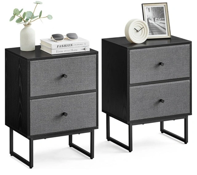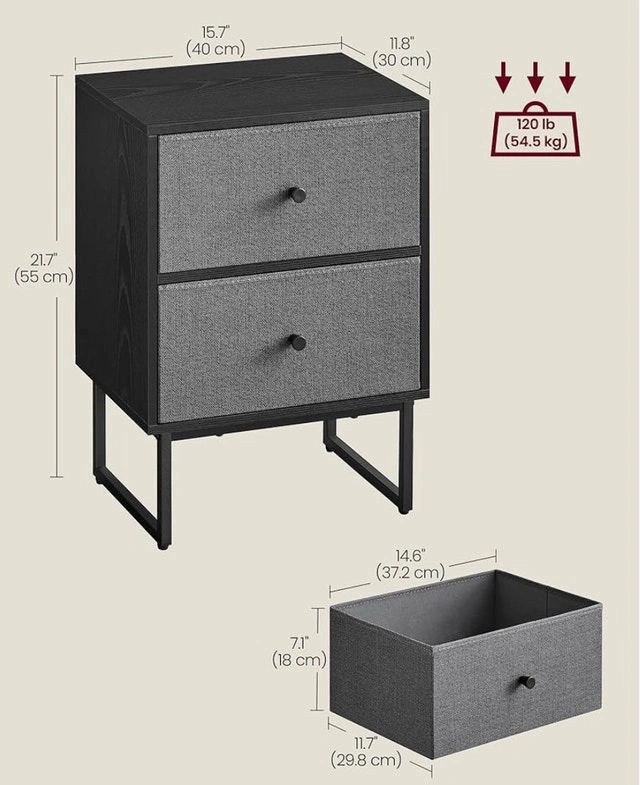 These VASAGLE nightstands are brand new and come as a set of two, perfect as side tables for your couch or bedside. They feature two fabric drawers, offering a blend of style and functionality. Approximate dimensions are 21.7" (55 cm) in height, 15.7" (40 cm) in width and 11.8" (30 cm) in depth. Each drawer is approximately 7.1" (18 cm) high, 11.7" (29.8 cm) wide and 14.6" (37.2 cm) deep. The legs are 5.9" (15cm) tall, providing space for easy cleaning and the nightstand has a load capacity of 120 lb (54.5 kg).