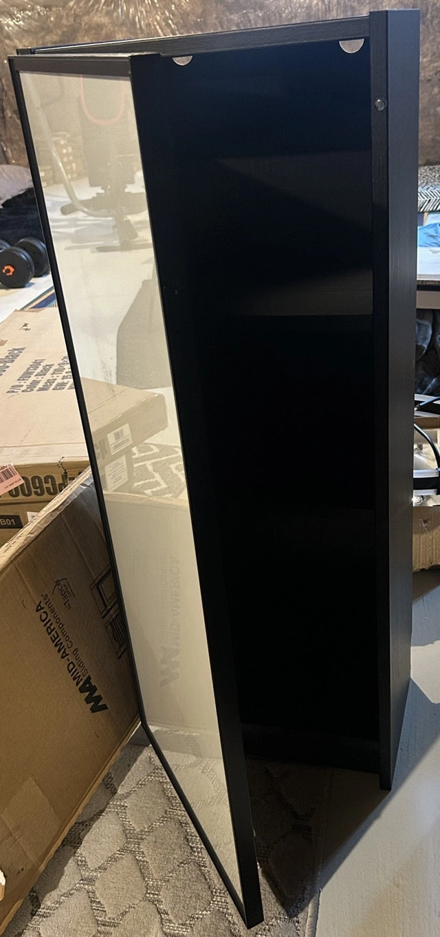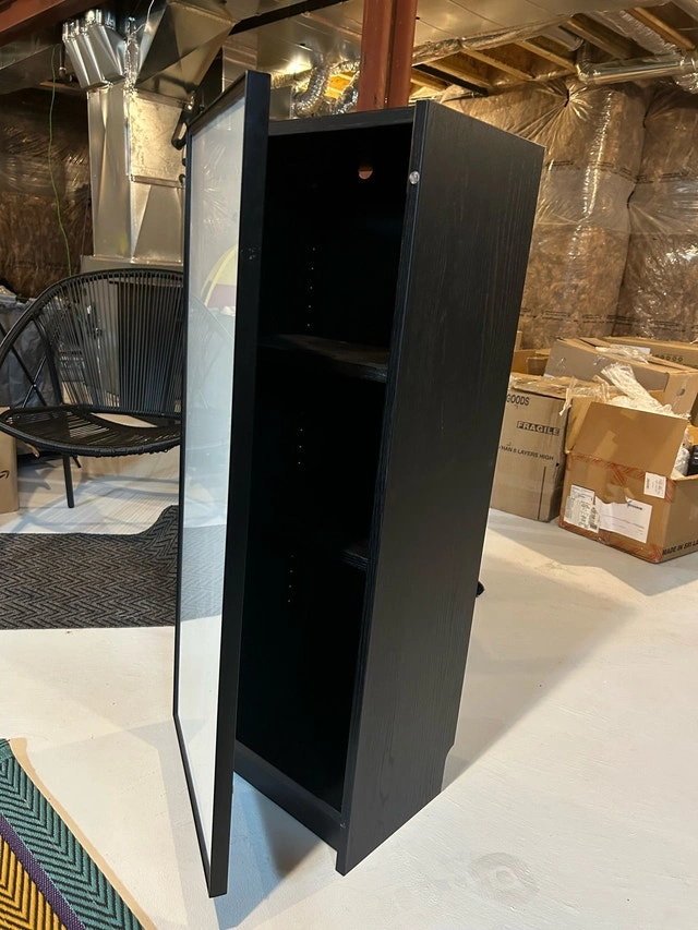 This is a new, black-brown bookcase, perfect for adding storage to any room. It features adjustable shelves, allowing you to customize the space to fit your needs.