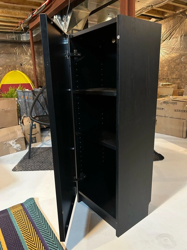 This is a new, black-brown bookcase, perfect for adding storage to any room. It features adjustable shelves, allowing you to customize the space to fit your needs.