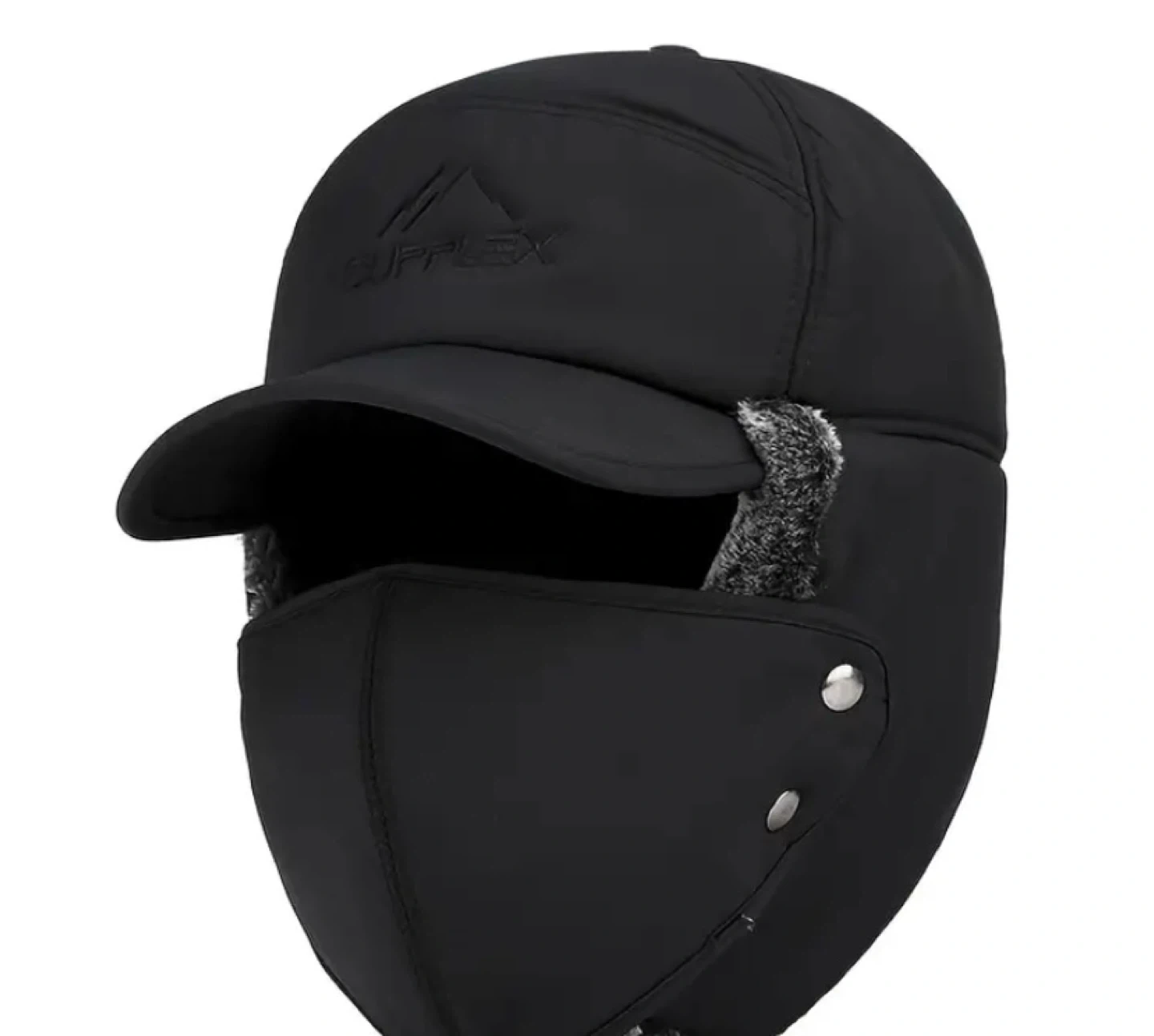 Stay warm this winter with this Supplex trapper hat! It features a face cover and ear flaps for extra protection from the cold. The hat is black and appears to be in good condition.