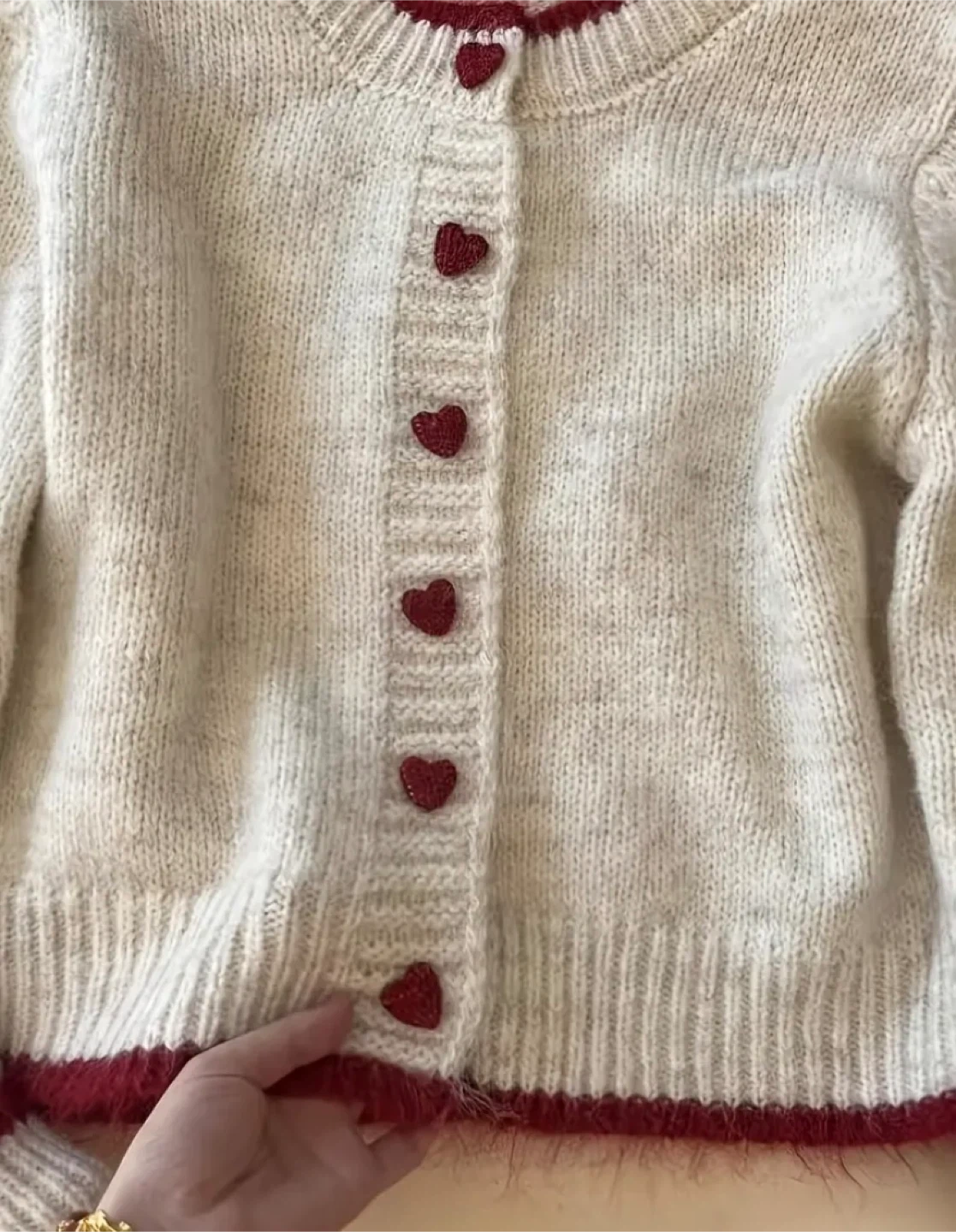 Super cute cream-colored knit cardigan with red heart buttons and trim! It's in great condition and perfect for layering or wearing on its own. The material is soft and cozy, making it a great addition to your wardrobe!