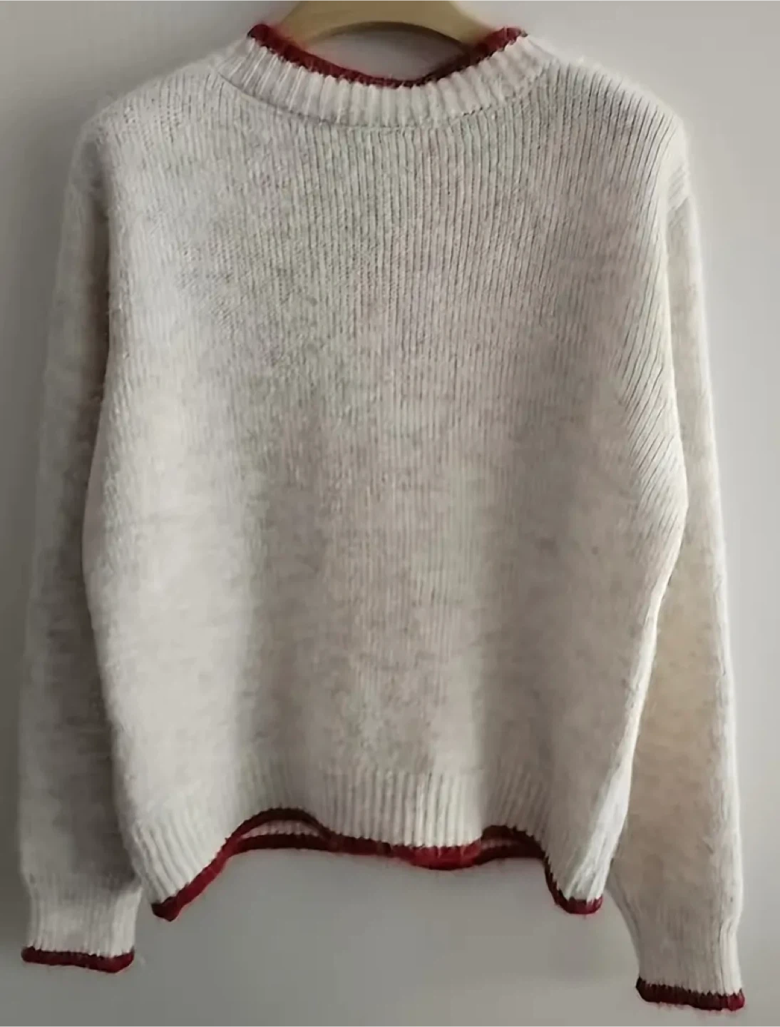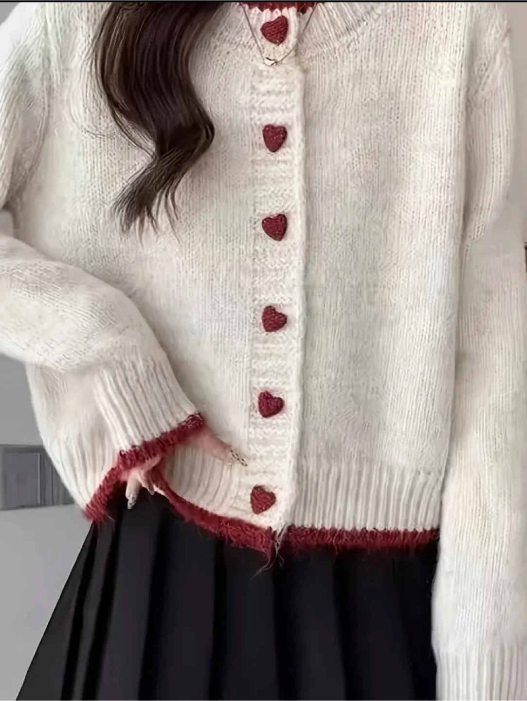 Super cute cream-colored knit cardigan with red heart buttons and trim! It's in great condition and perfect for layering or wearing on its own. The material is soft and cozy, making it a great addition to your wardrobe!