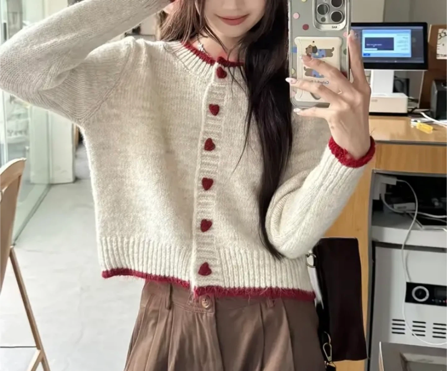Heart Button Knit Cardigan - Cream & Red