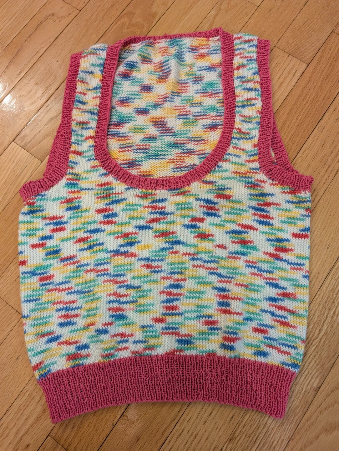Selling a cute and colourful knit vest! It features a unique pattern with red, blue, yellow, and green accents on a white background, finished with a pink trim. Perfect for adding a pop of colour to your wardrobe