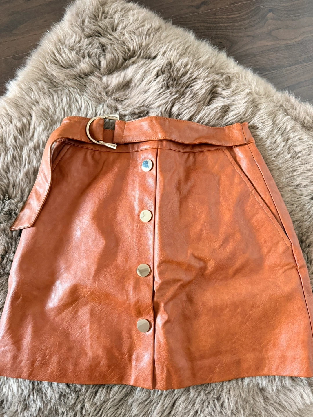 Selling a Zara mini skirt in a lovely brown colour! It's a size XS and in great condition. Perfect for adding a bit of edge to your wardrobe. The skirt features a belted waist and front button detailing.