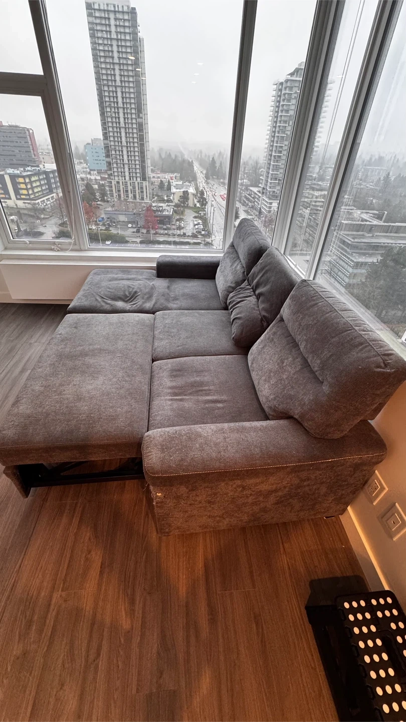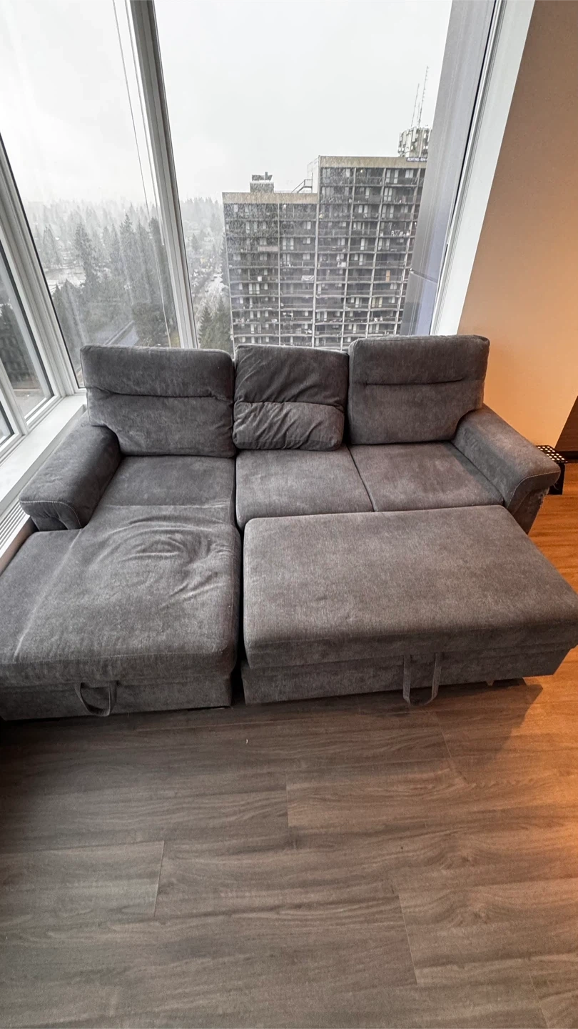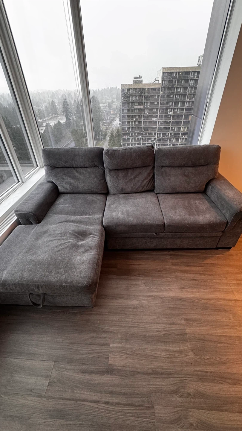 Selling a comfy grey sectional sofa! It's in good condition and would be perfect for a living room or entertainment space. It features a pull-out bed and storage underneath the chaise. Great for guests or extra storage!
