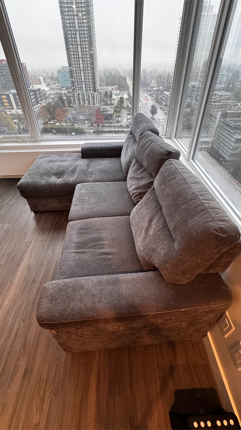 Selling a comfy grey sectional sofa! It's in good condition and would be perfect for a living room or entertainment space. It features a pull-out bed and storage underneath the chaise. Great for guests or extra storage!