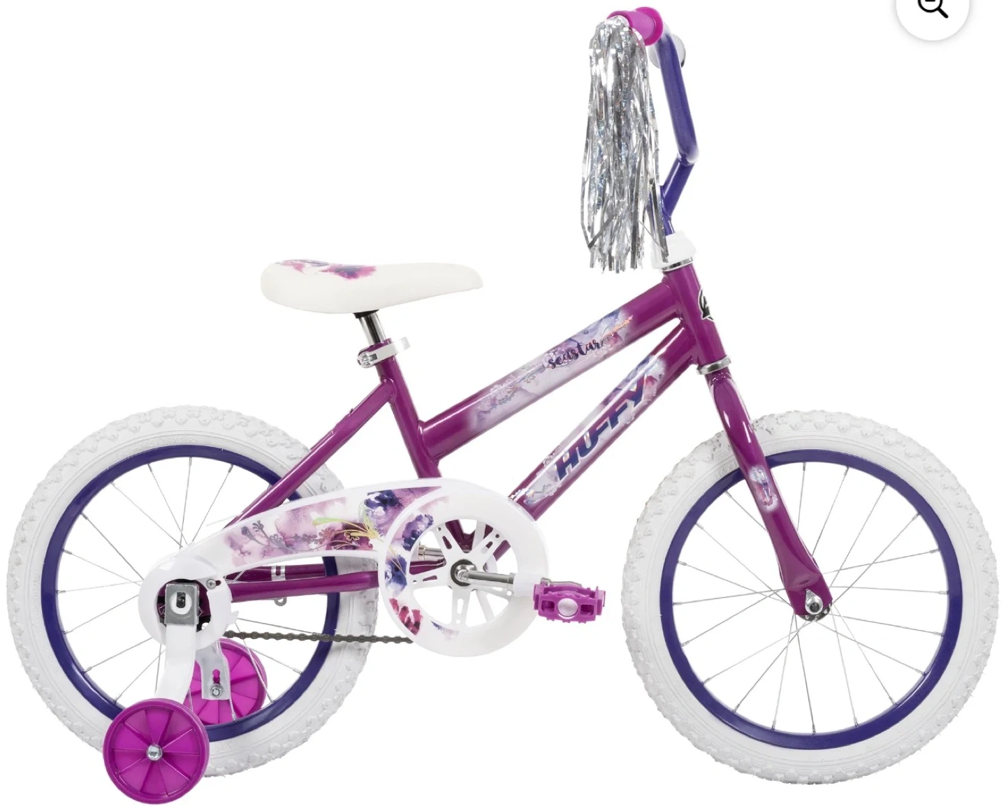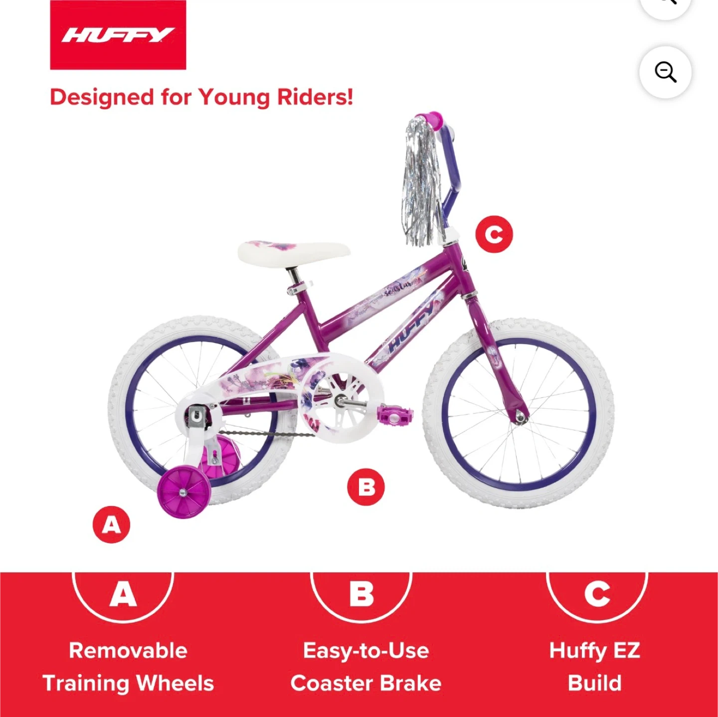 This is a Huffy Sea Star girls bike designed for young riders! It comes with removable training wheels and an easy-to-use coaster brake. It also features Huffy EZ build, so assembly is a breeze. The bike has a 16" wheel size and is purple and white.