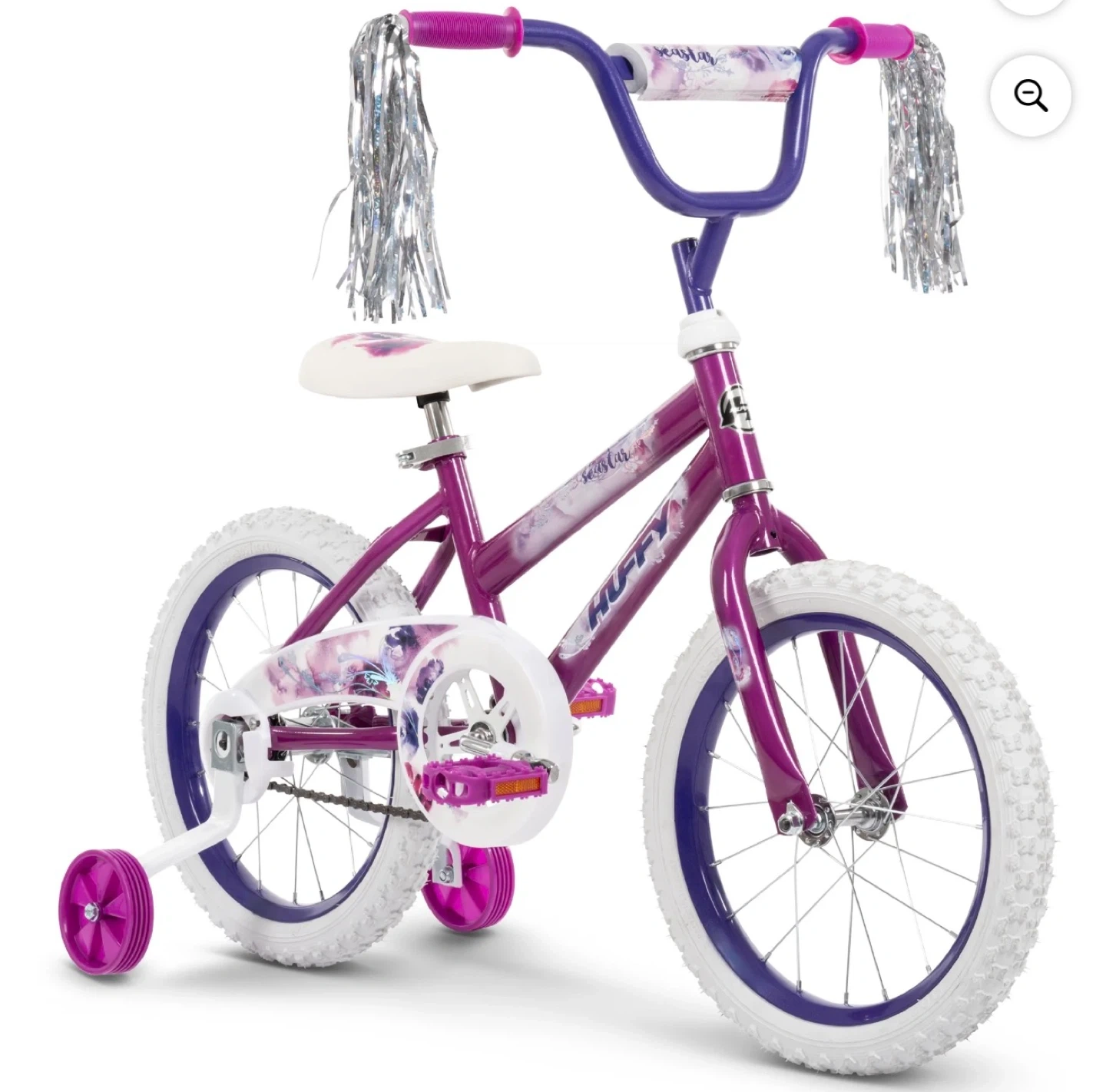 This is a Huffy Sea Star girls bike designed for young riders! It comes with removable training wheels and an easy-to-use coaster brake. It also features Huffy EZ build, so assembly is a breeze. The bike has a 16" wheel size and is purple and white.