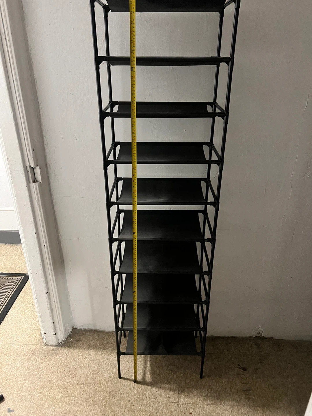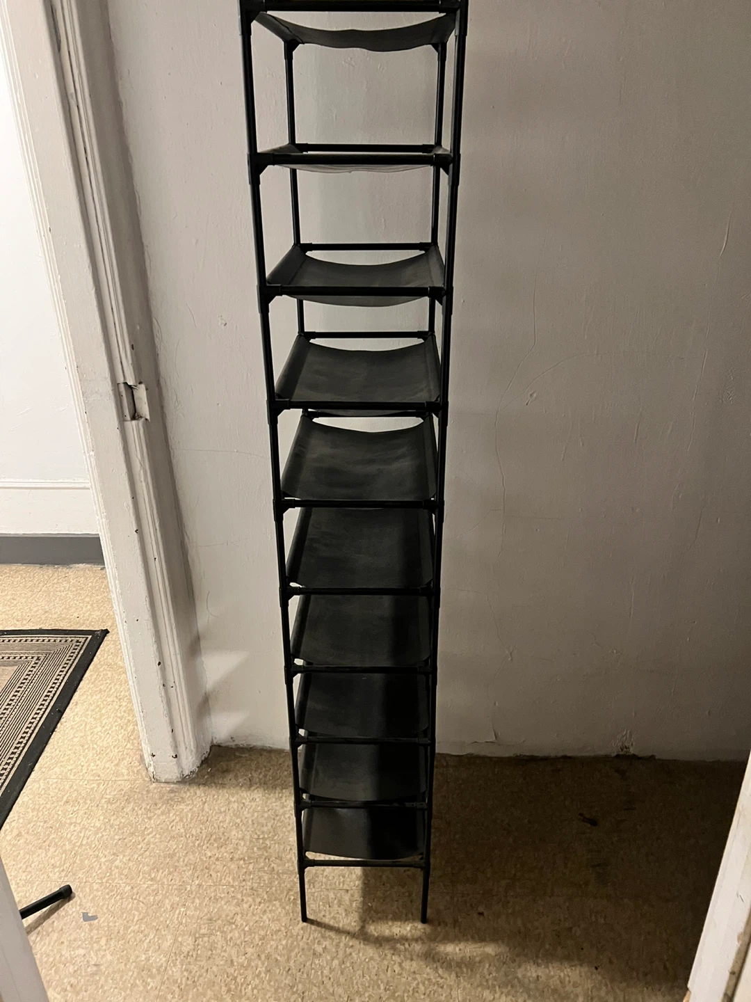 Selling a black 9-tier shoe rack. It's in great condition and ready to organize your shoes! It measures approximately 68 inches tall and about 10 inches wide.