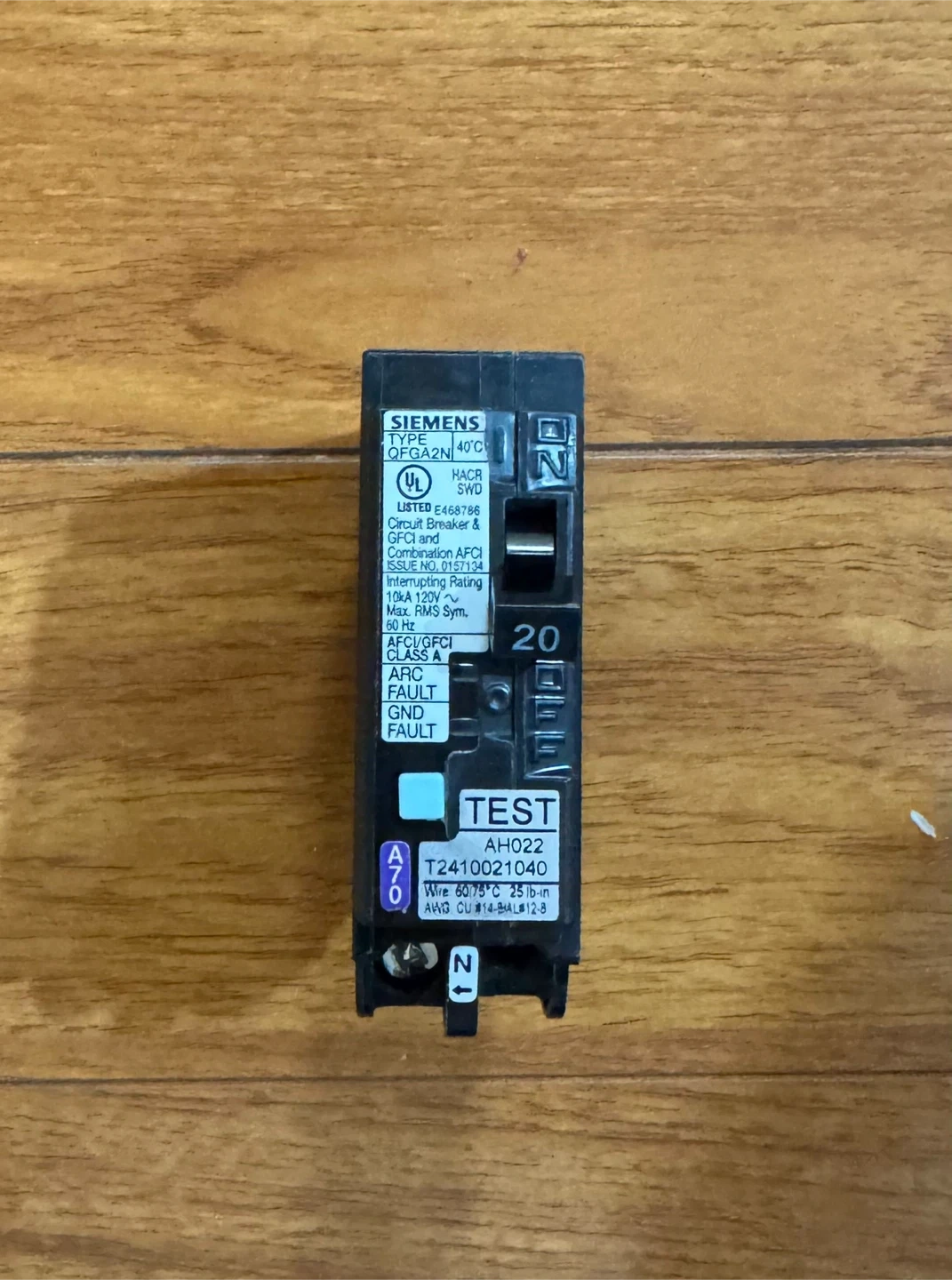 Selling a Siemens QFGA2N 20A circuit breaker. It's in good condition and ready to use. Features include AFCI/GFCI Class A, Arc Fault, and Ground Fault protection. Wire rating is 60/75°C, 25 lb-in, AWG CU #14-8/AL #12-8