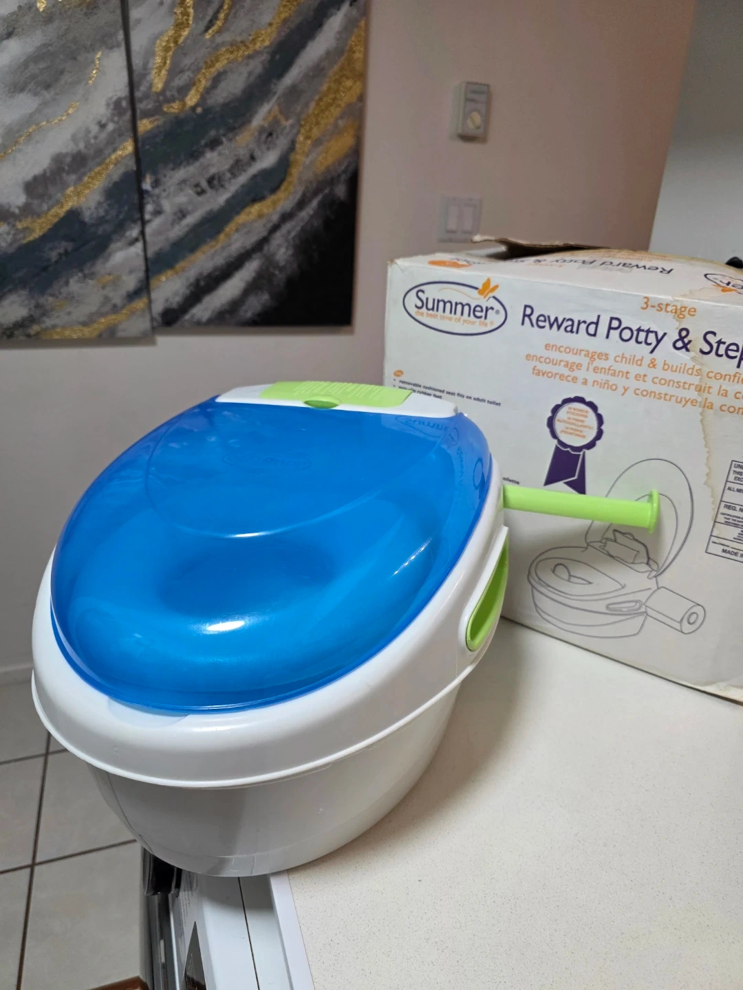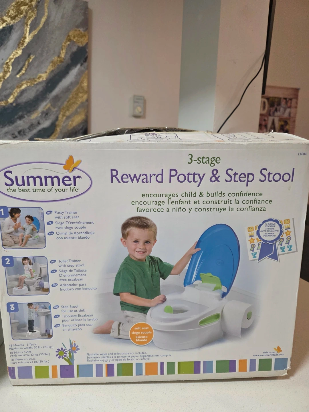 Unused, openbox. Selling a Summer 3-Stage Reward Potty & Step Stool. It's a great tool to encourage your child and builds confidence. It can be used as a potty, trainer seat, or step stool. Recommended for kids 18 months and up to 50 lbs. Comes with the box