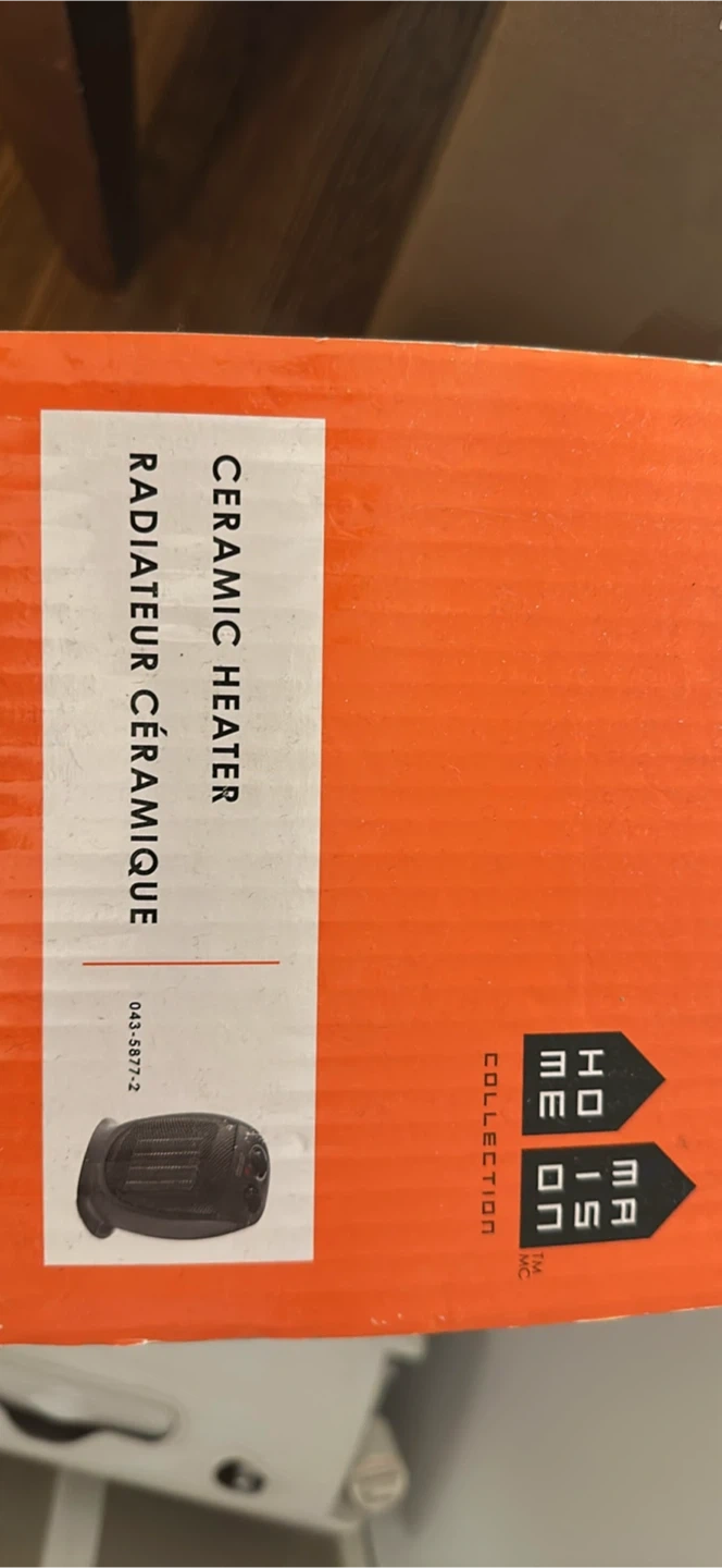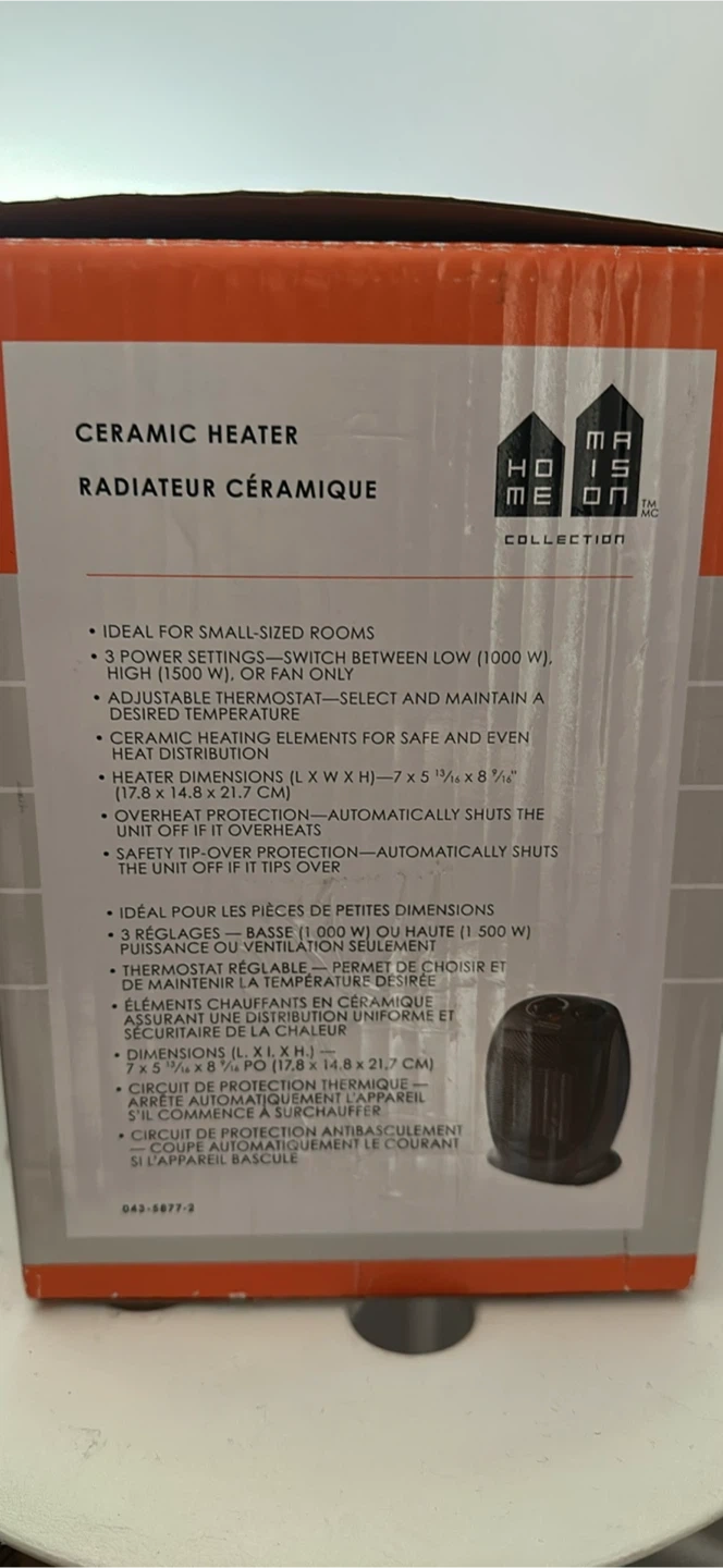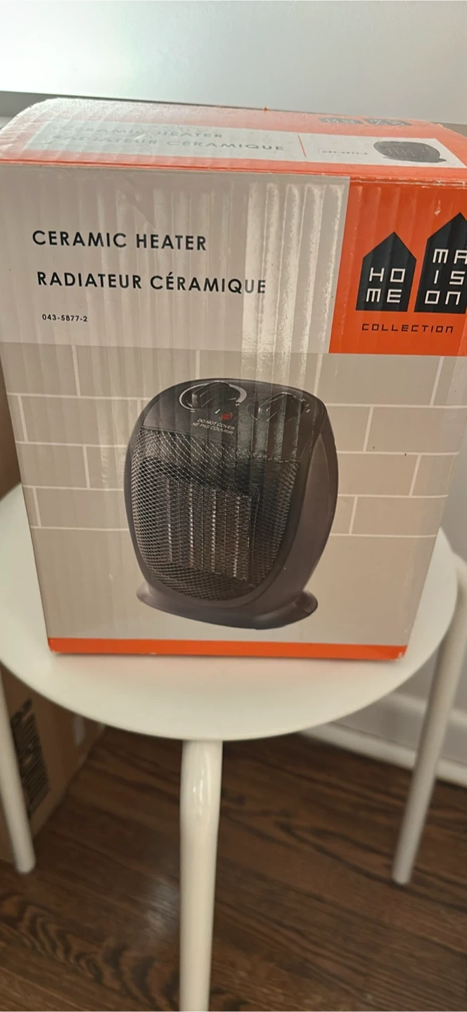 Selling a brand new Maison Home Collection ceramic heater, still in its original box! It's ideal for small-sized rooms and has 3 power settings: low (1000 W), high (1500 W), or fan only. It also features an adjustable thermostat to select and maintain a desired temperature. The heater dimensions are 7 x 5 13/16 x 8 1/2 inches (17.8 x 14.8 x 21.7 cm). It also has overheat protection that automatically shuts the unit off if it overheats, as well as tip-over protection that automatically shuts the unit off if it tips over