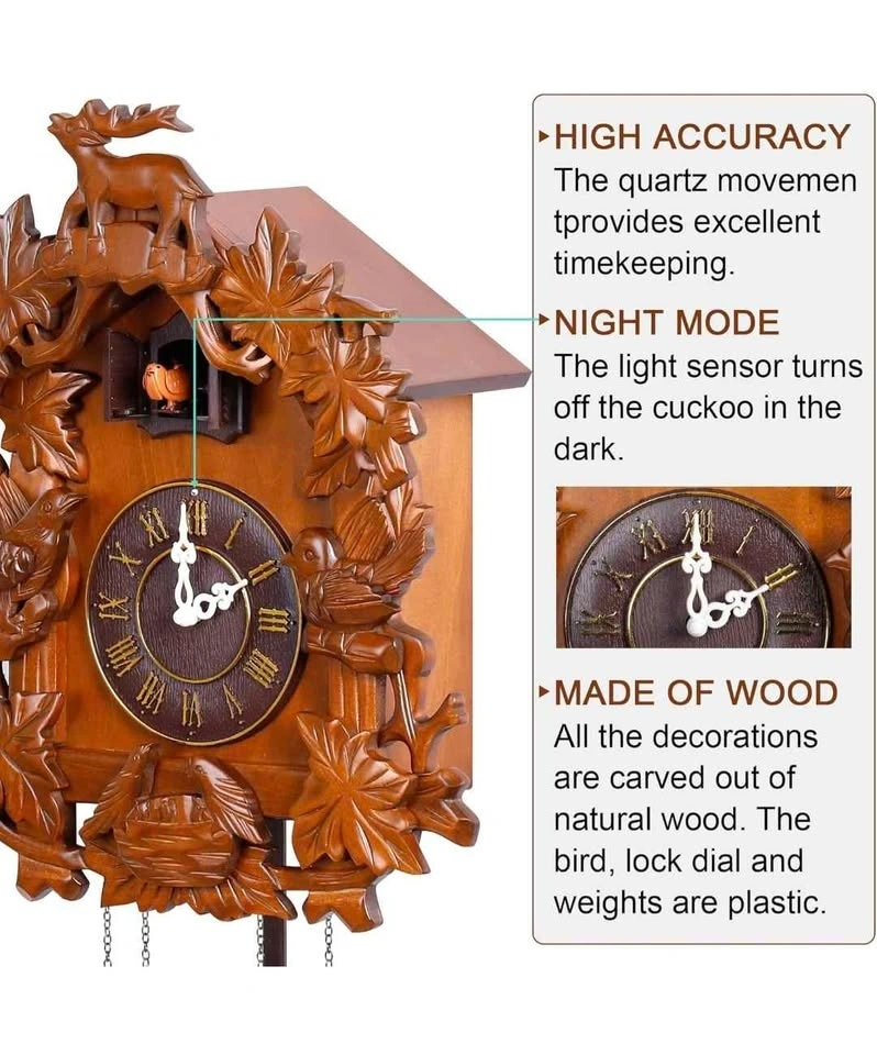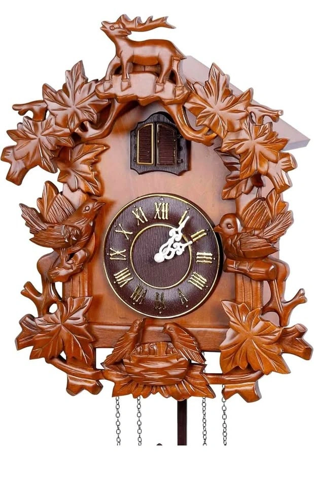 - Solid Wood, Forest Deer style cuckoo clock with hand-carved decorations.