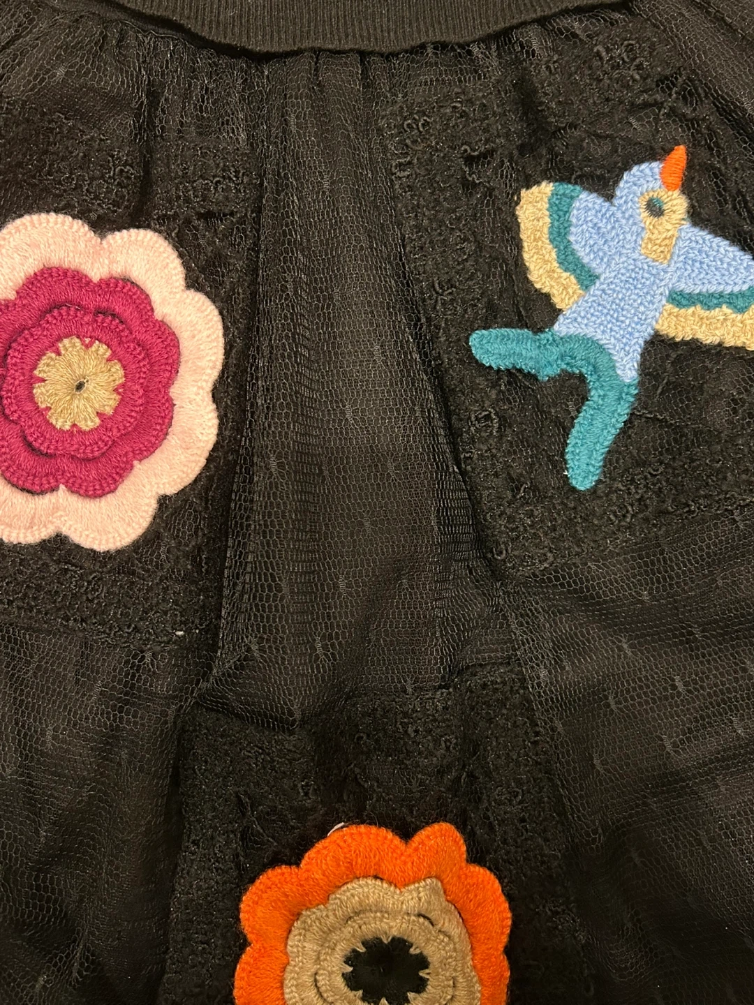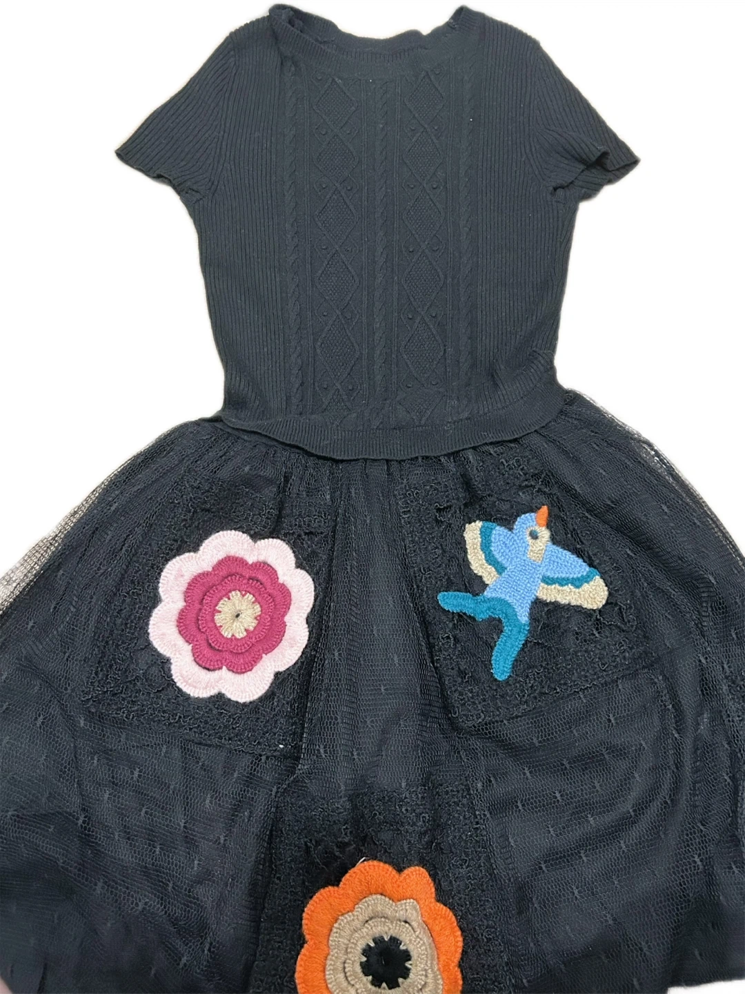 Selling a cute Valentino dress! It's black with adorable crochet flower and bird details on the skirt. The top is a ribbed knit, and the skirt has a layer of tulle. Tag says 'Taglia/Size', but it doesn't specify the size in standard terms.