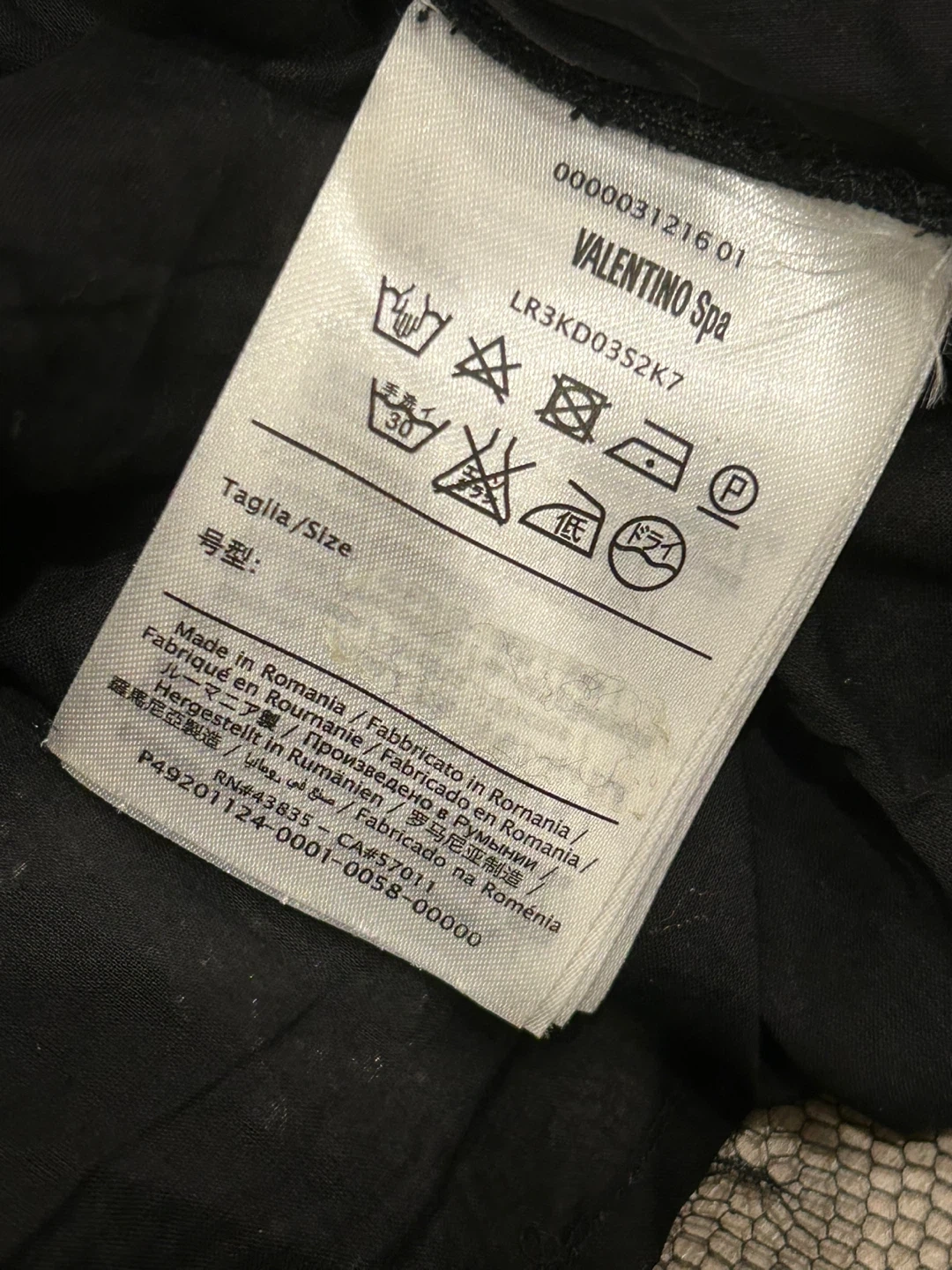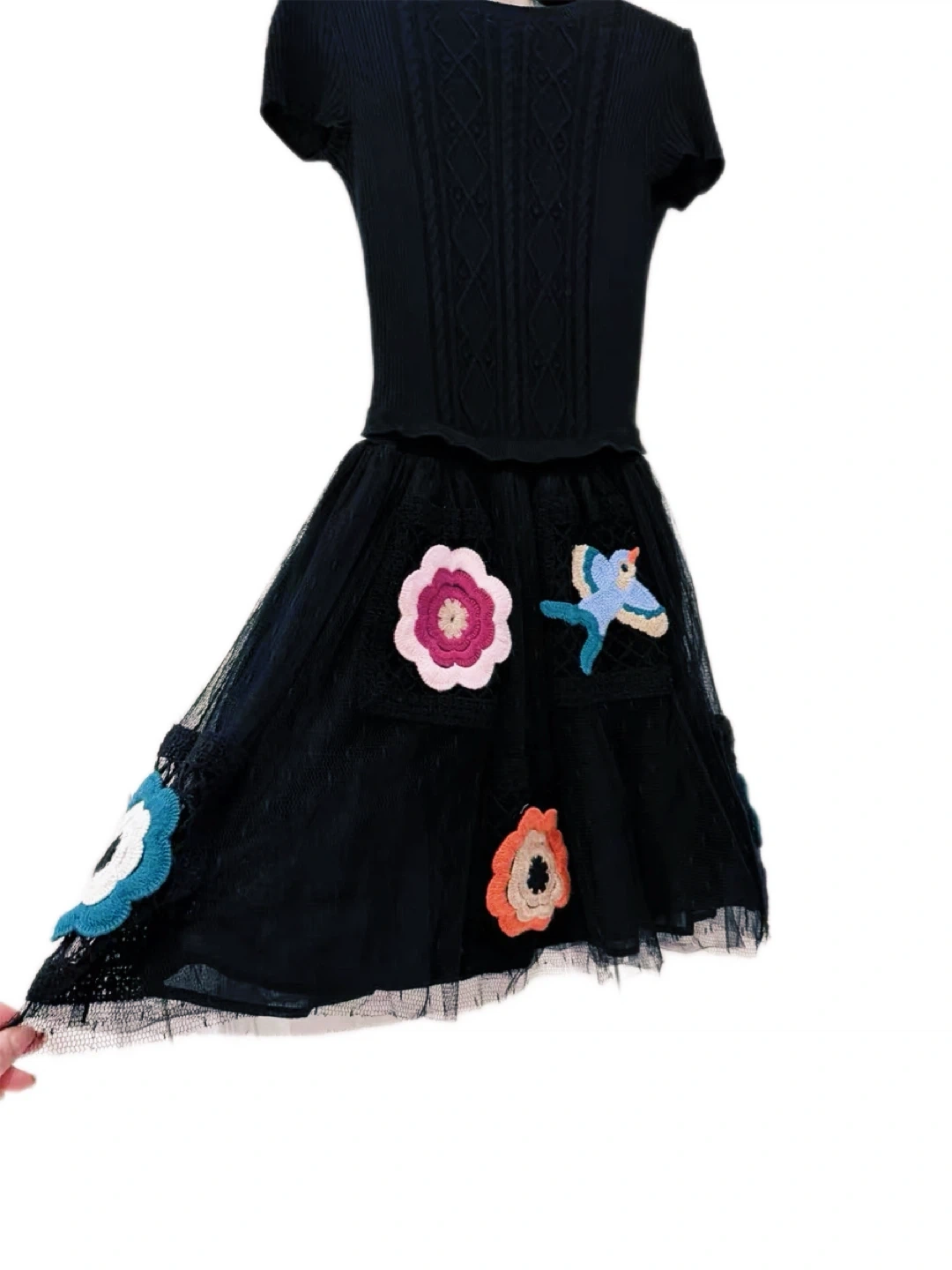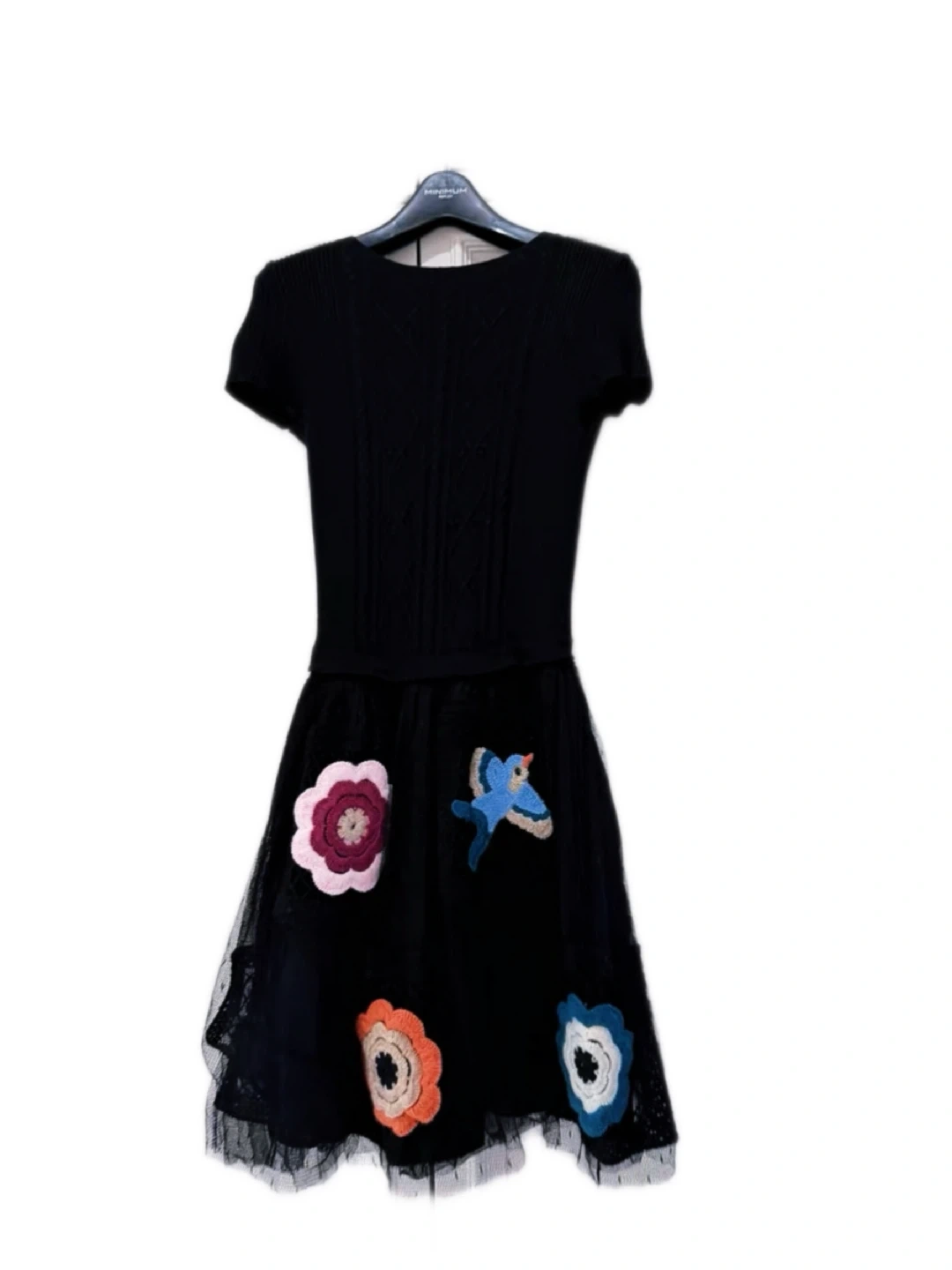 Selling a cute Valentino dress! It's black with adorable crochet flower and bird details on the skirt. The top is a ribbed knit, and the skirt has a layer of tulle. Tag says 'Taglia/Size', but it doesn't specify the size in standard terms.
